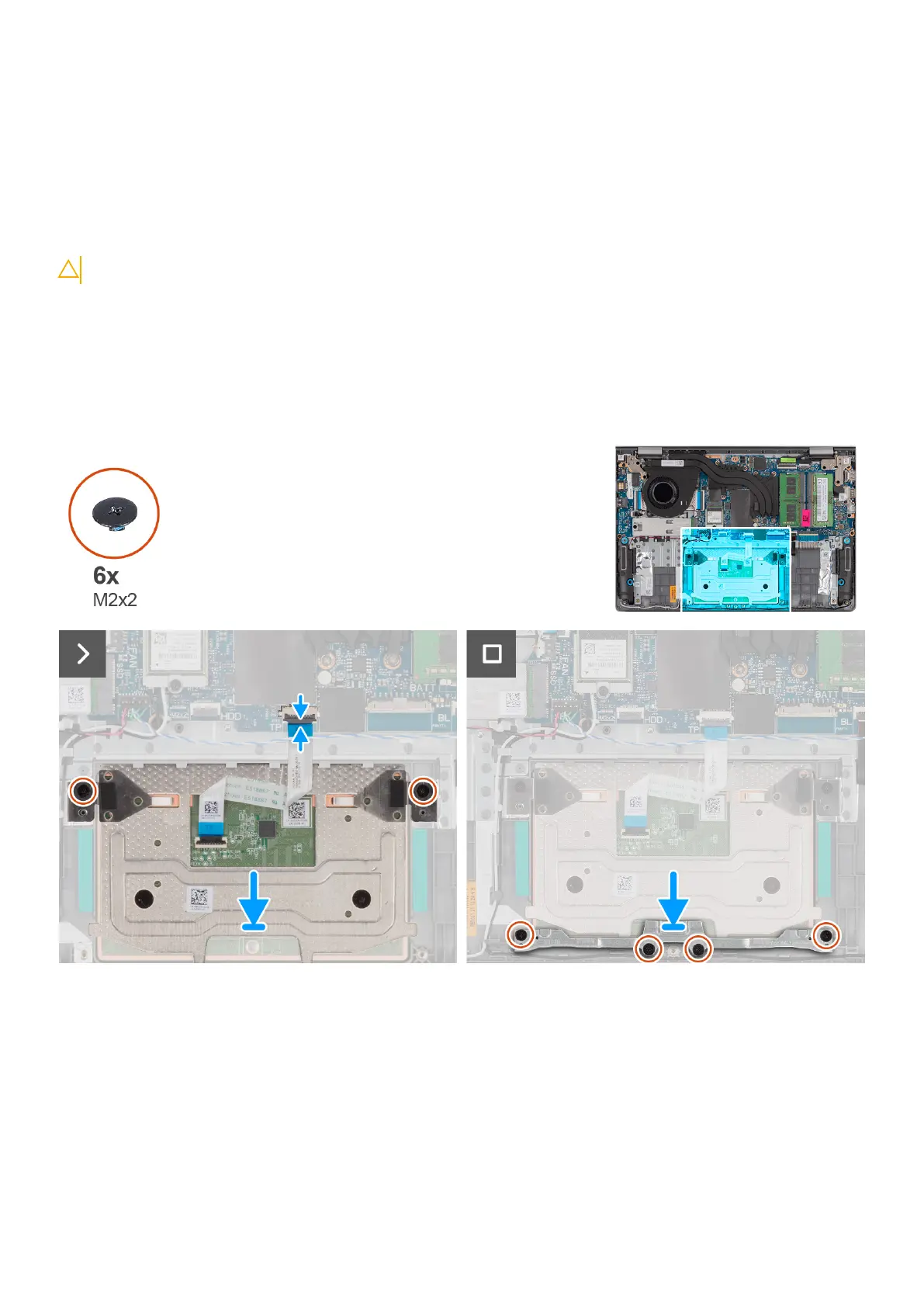 7. Replace the four (M2x2) screws that secure the touchpad bracket to the palm-rest and keyboard assembly.