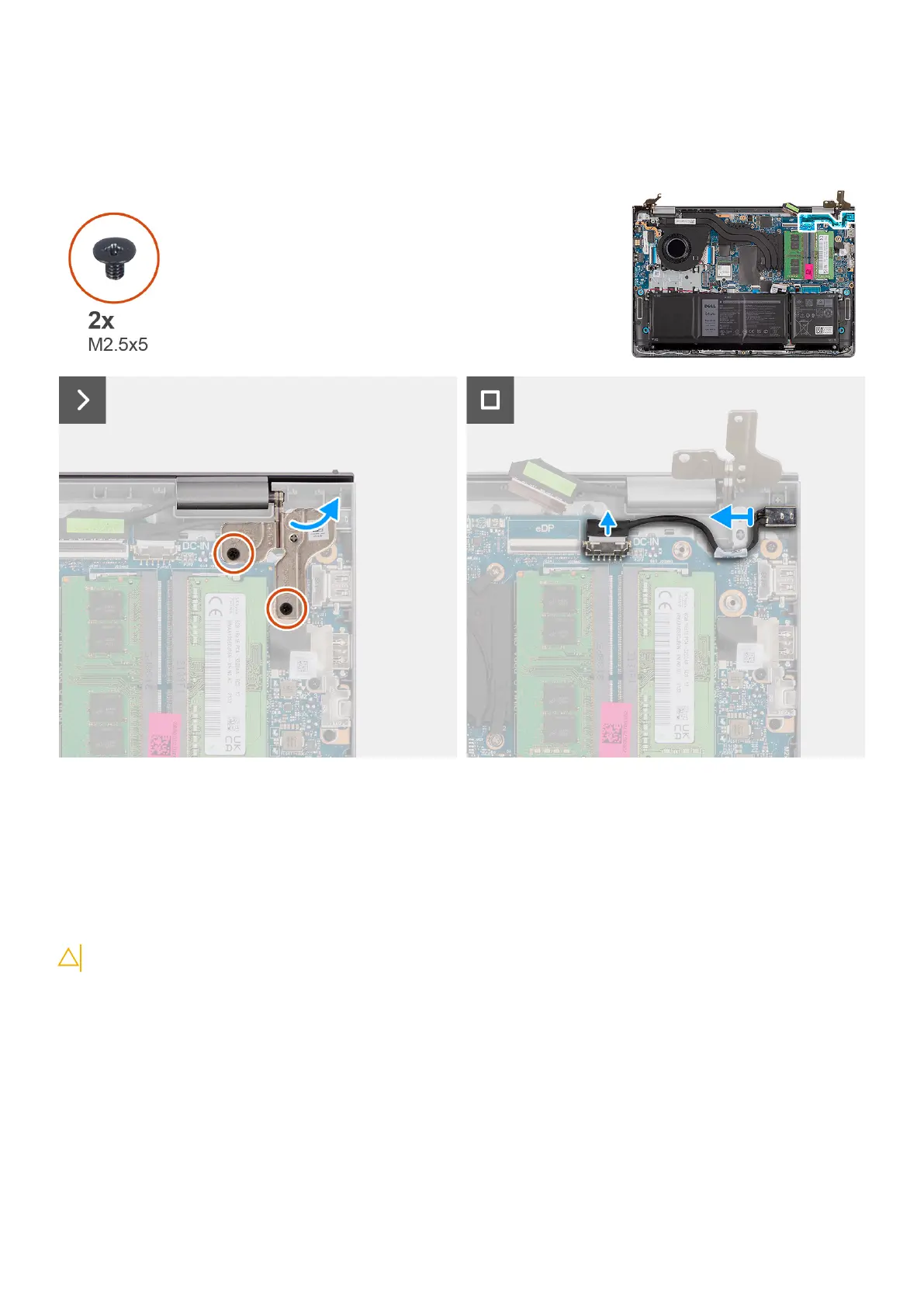 1. Remove the two (M2.5x5) screws that secure the right hinge to the palm-rest and keyboard assembly.