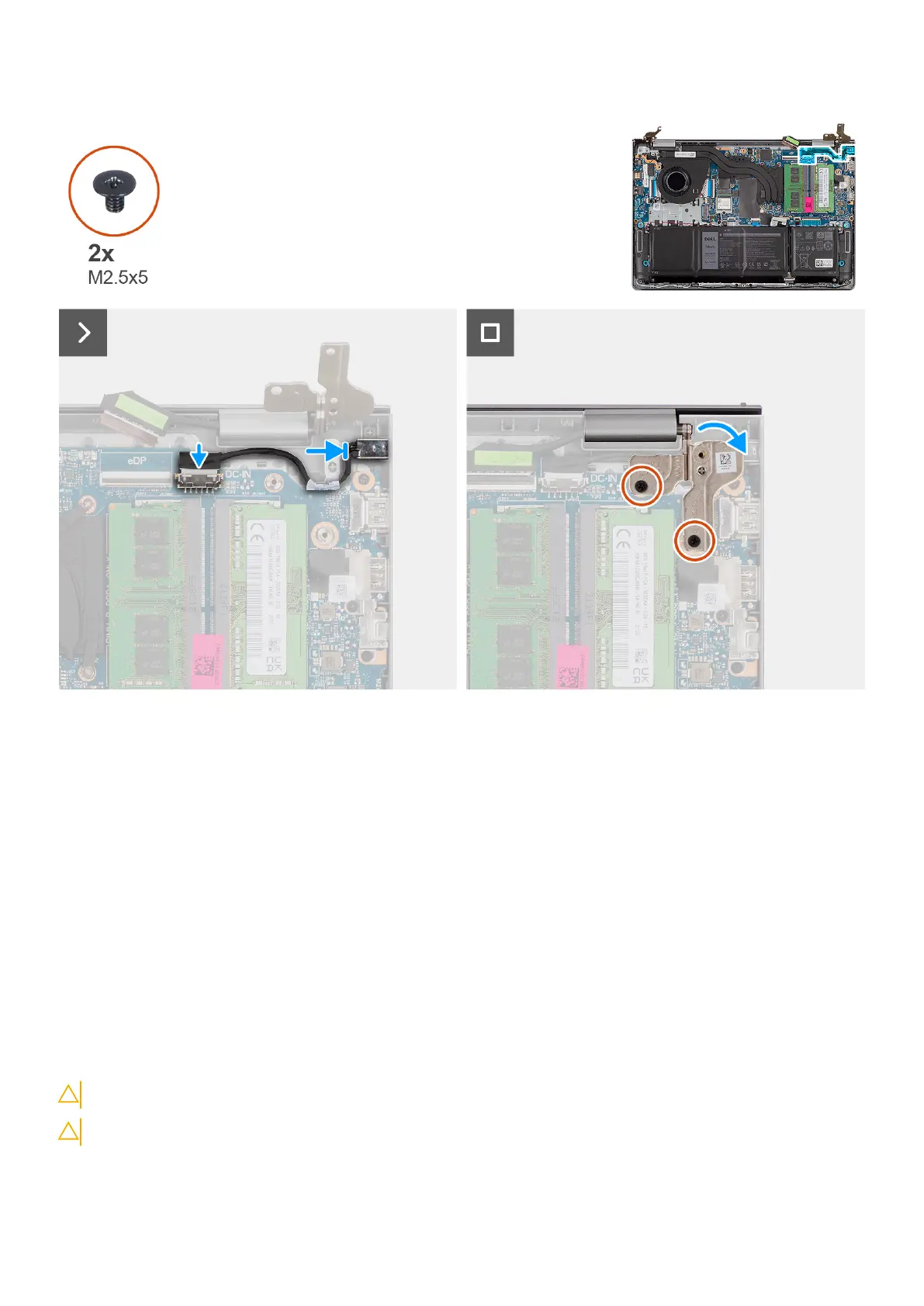 3. Fold the right hinge down and install the two (M2.5x5) screws to secure it to the palm-rest and keyboard assembly.