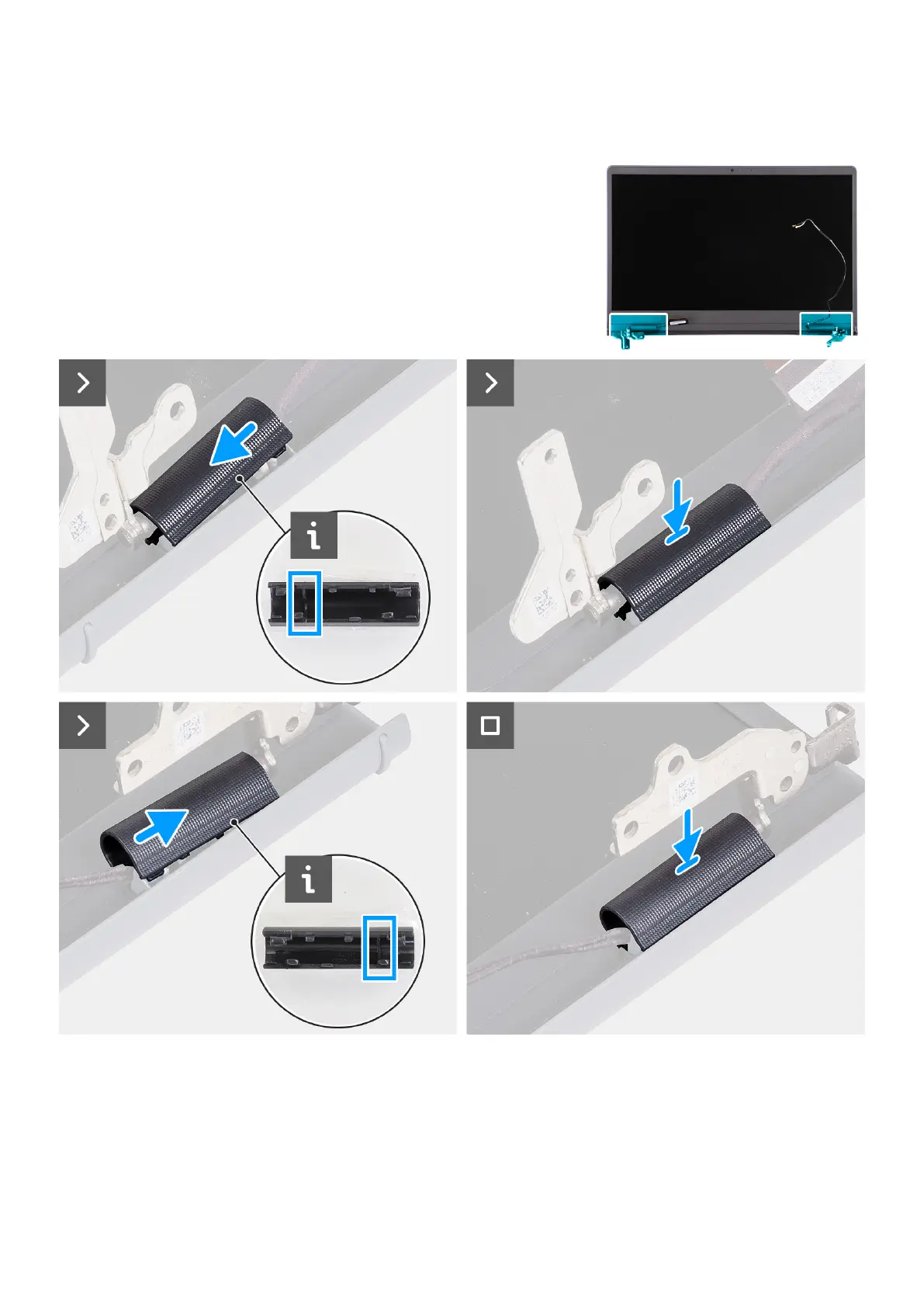 The following images indicate the location of the hinge caps and provide a visual representation of the installation procedure.
