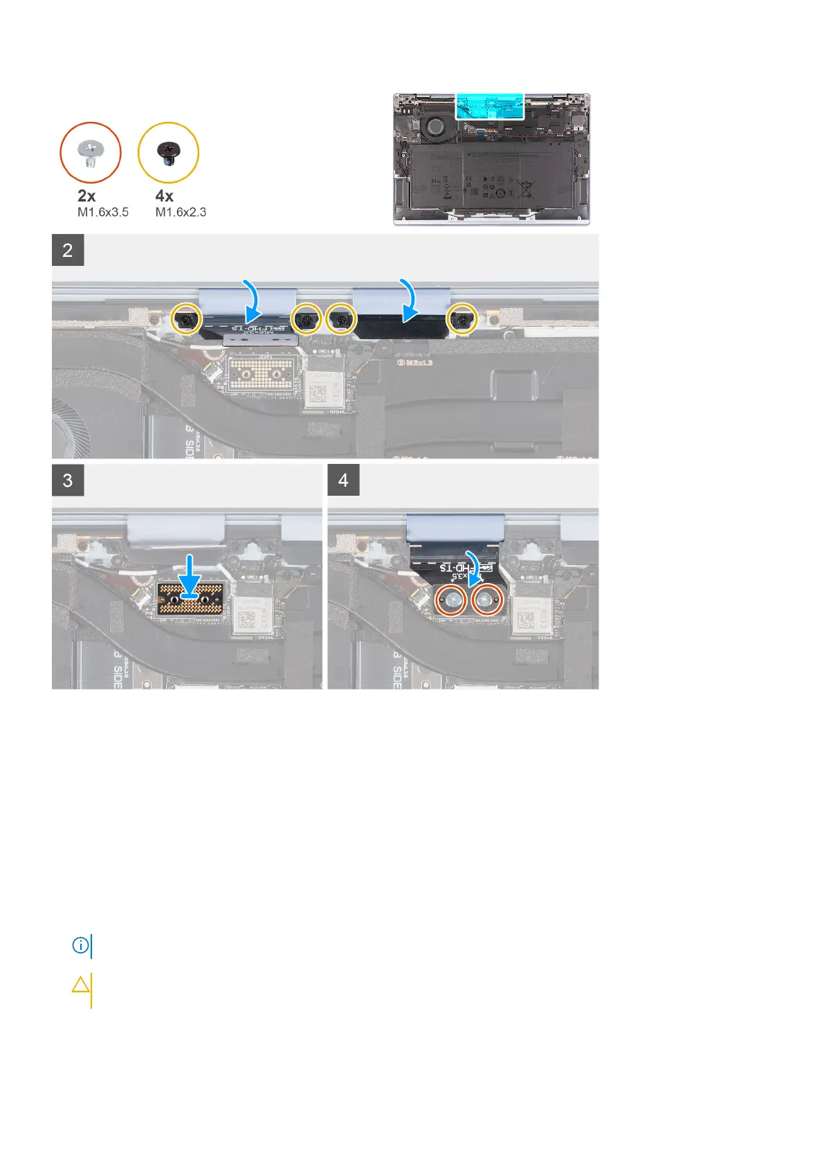 7. Replace the four screws (M1.6x2.3) that secure the two display-assembly cable brackets to the palm-rest and keyboard