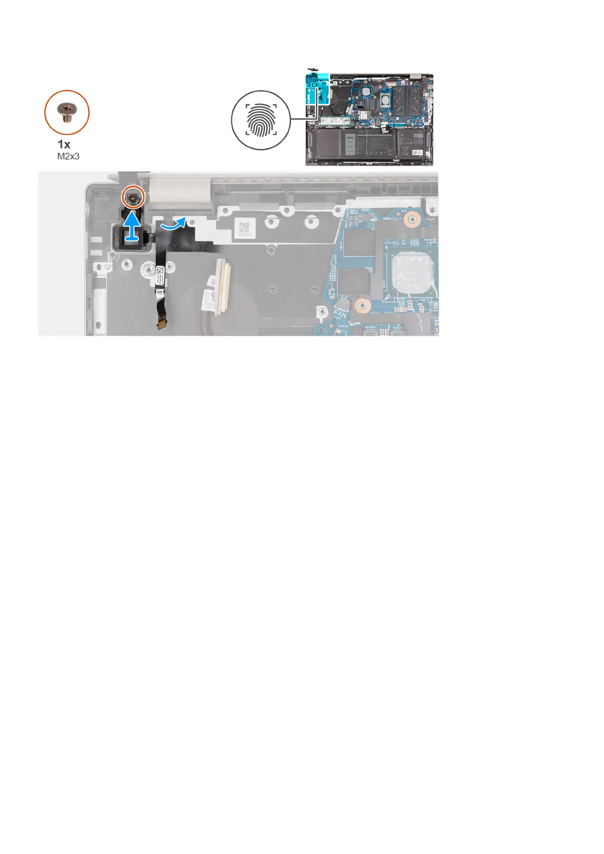 1. Remove the screw (M2x3) that secures the power button with optional fingerprint reader to the palm-rest and keyboard