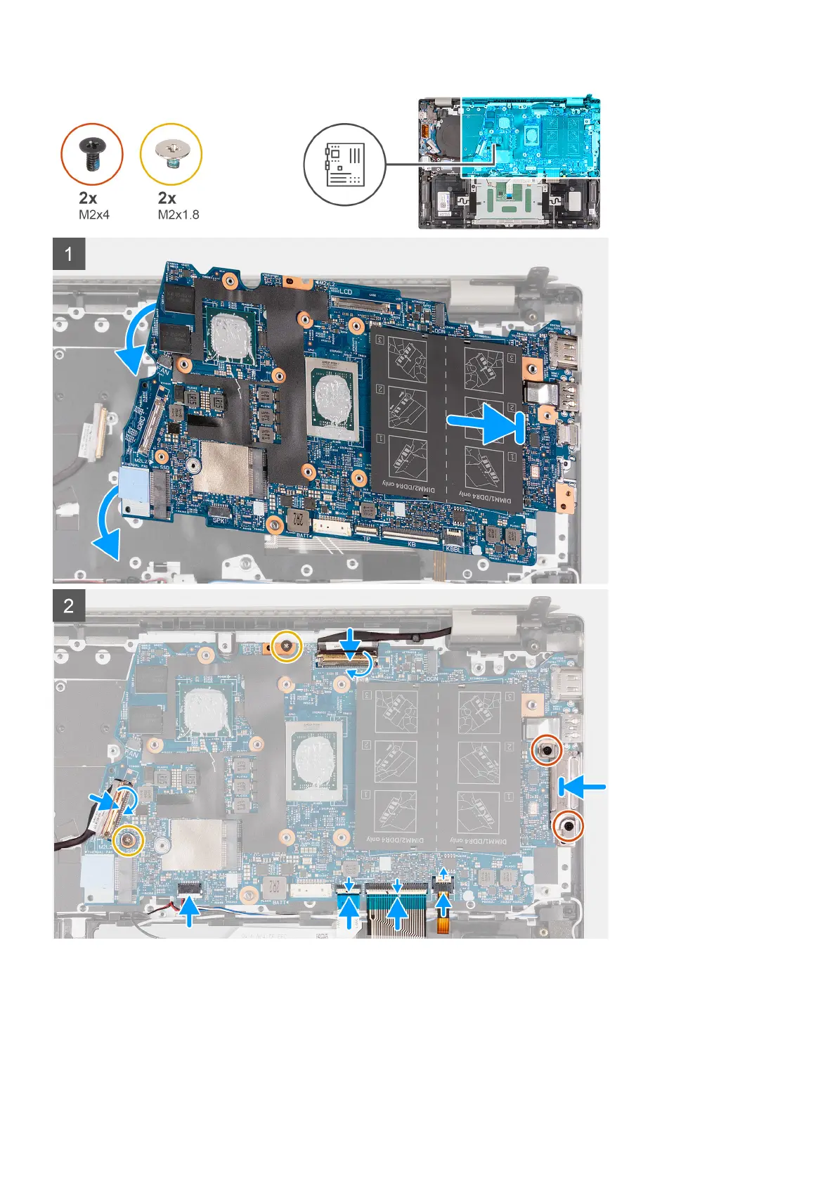 3. Replace the two screws (M2x1.8) that secure the system board to the palm-rest and keyboard assembly.