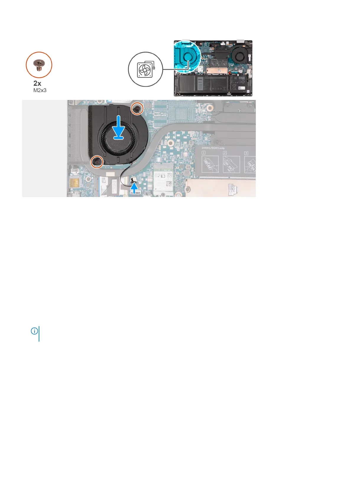 3. Replace the two screws (M2x3) that secure the left fan to the palm-rest and keyboard assembly.