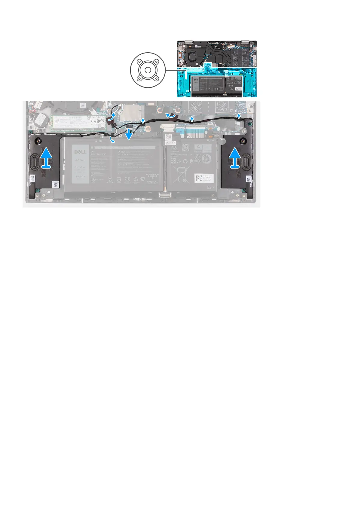4. Remove the speaker cable from the routing guides on the palm-rest and keyboard assembly.