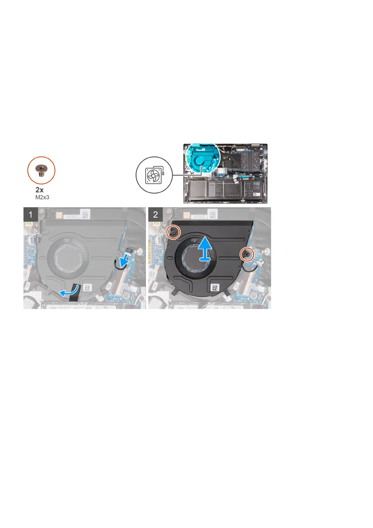 2. Remove the two screws (M2x3) that secure the fan to the palm-rest and keyboard assembly.