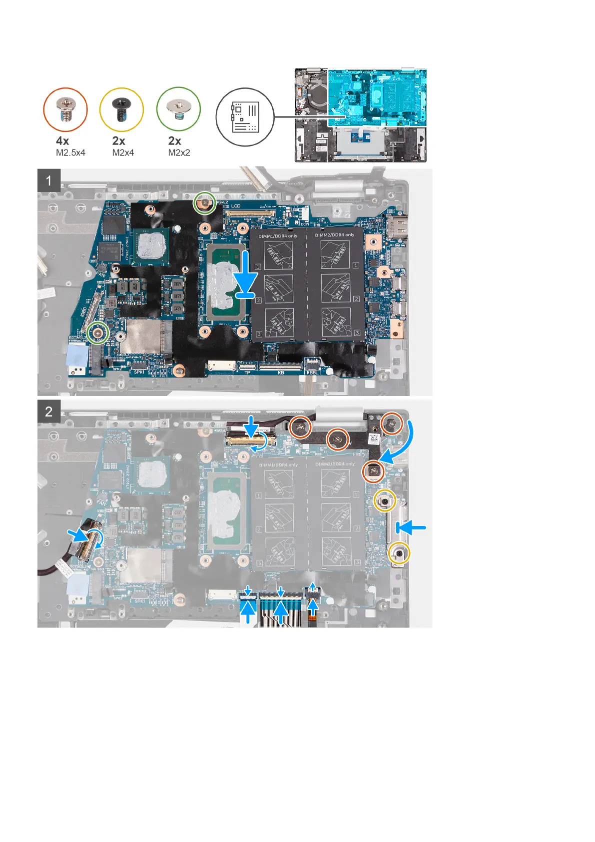 2. Replace the two screws (M2x2) that secure the system board to the palm-rest and keyboard assembly.
