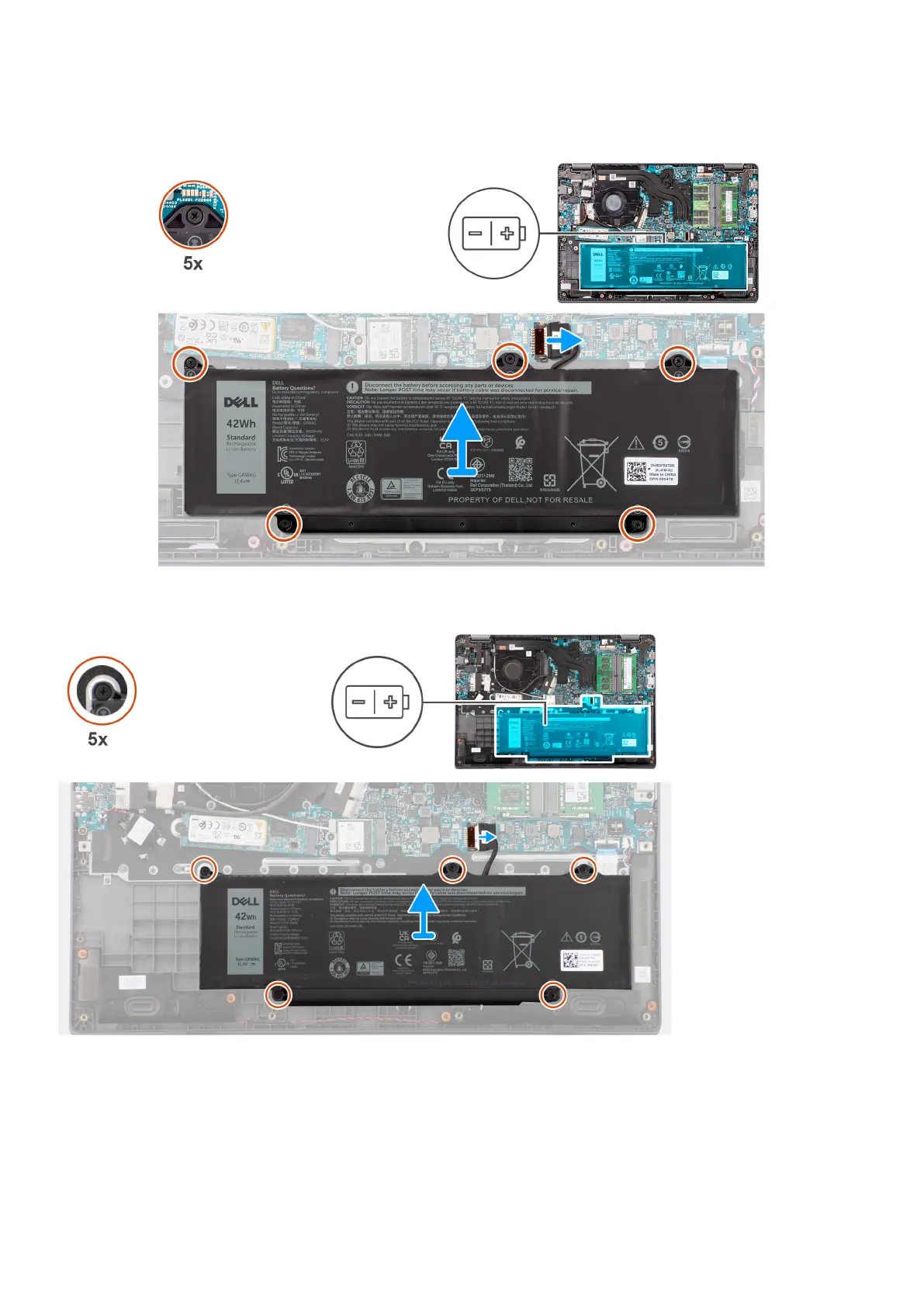 2. Loosen the five captive screws that secure the battery to the palm-rest and keyboard assembly.