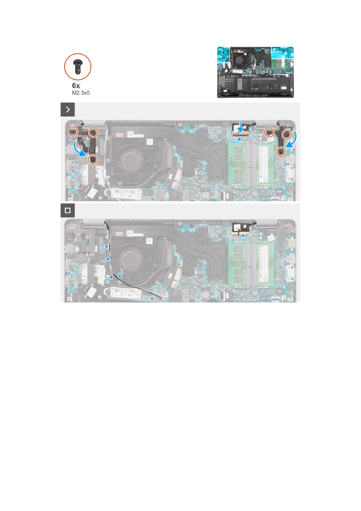 4. Replace the six screws (M2.5x5) to secure the display hinges to the palm-rest and keyboard assembly.