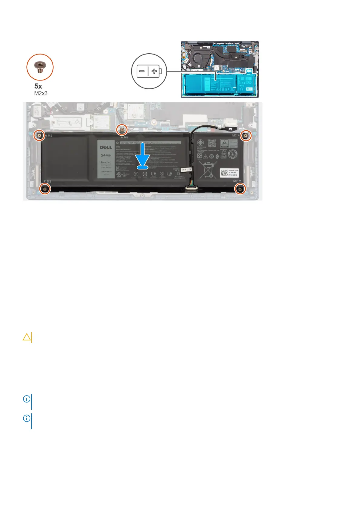3. Replace the five screws (M2x3) to secure the 4-cell battery to the palm-rest and keyboard assembly.