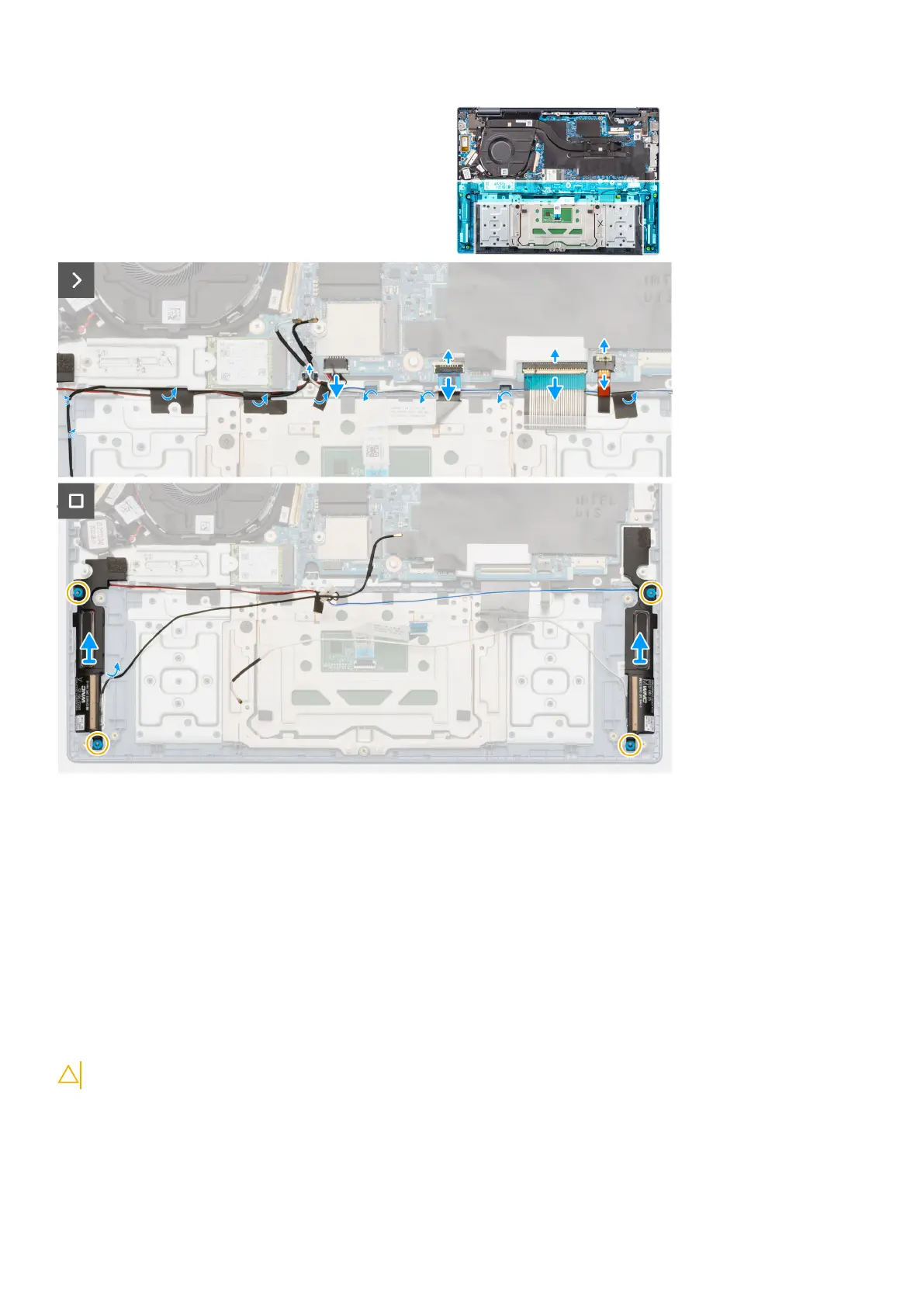 6. Unroute and remove the wireless-antenna cables and the speaker cables from the routing guides on palm-rest and keyboard