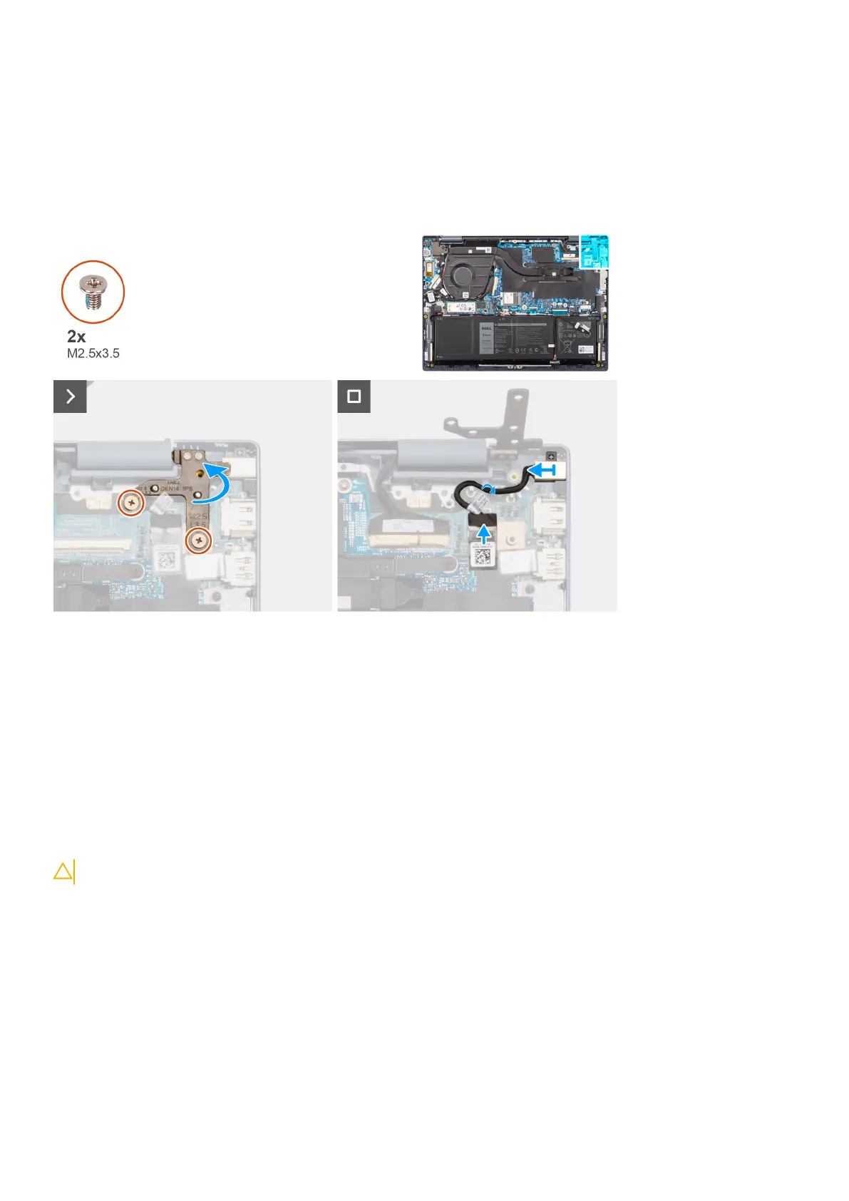 1. Remove the two screws (M2.5x3.5) that secure the right display hinge to the system board and the palm-rest and keyboard