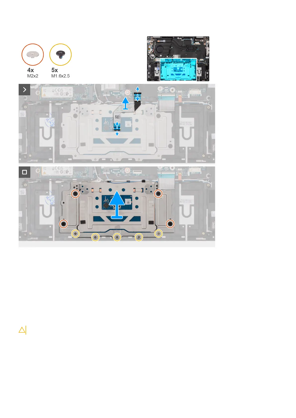 4. Remove the five screws (M1.6x2.5) and the four screws (M2x2) that secure the touchpad to the palm-rest and keyboard