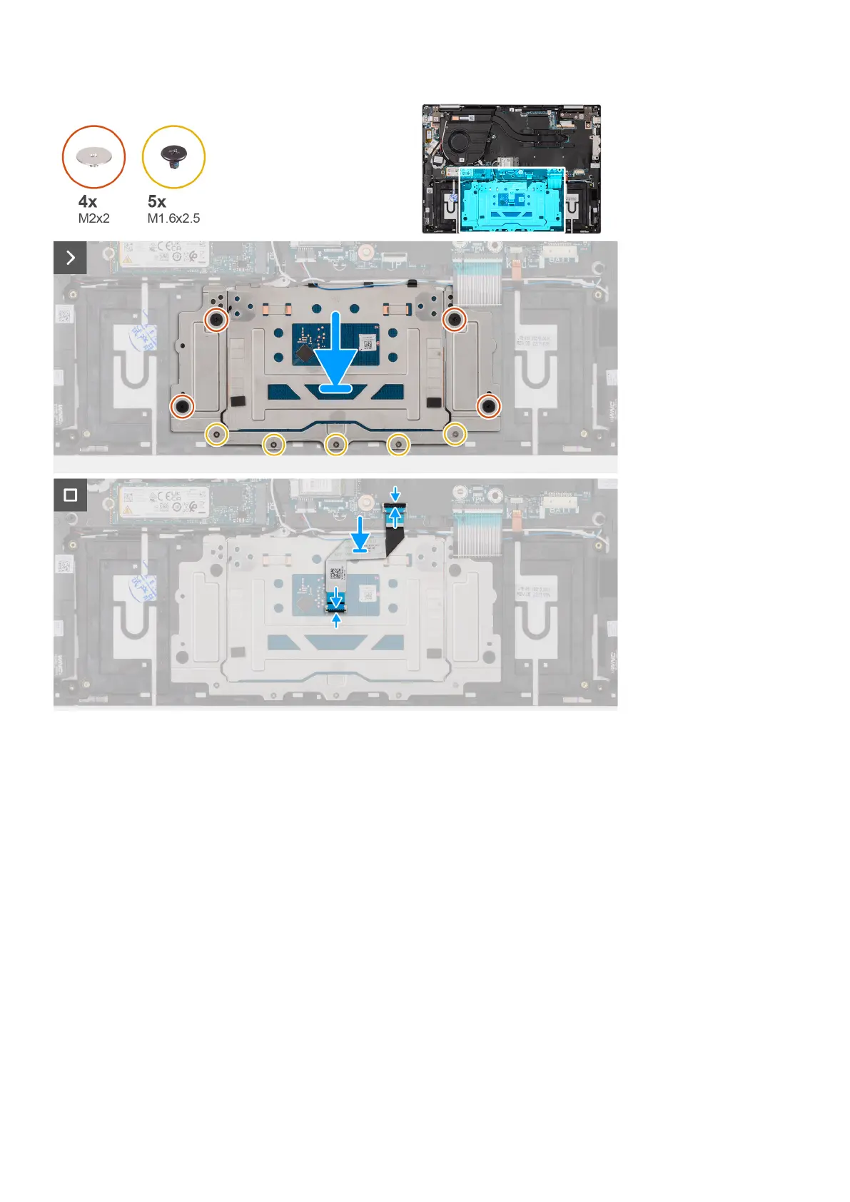 3. Replace the four screws (M2x2) and the five screws (M1.6x2.5) that secure the touchpad to the palm-rest and keyboard