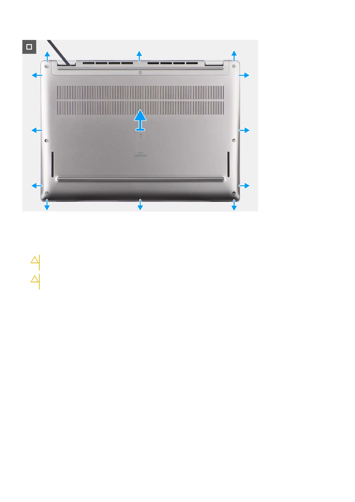 CAUTION: Do not pry upwards from the edge near the vents, at the top side of the base cover, as it damages
