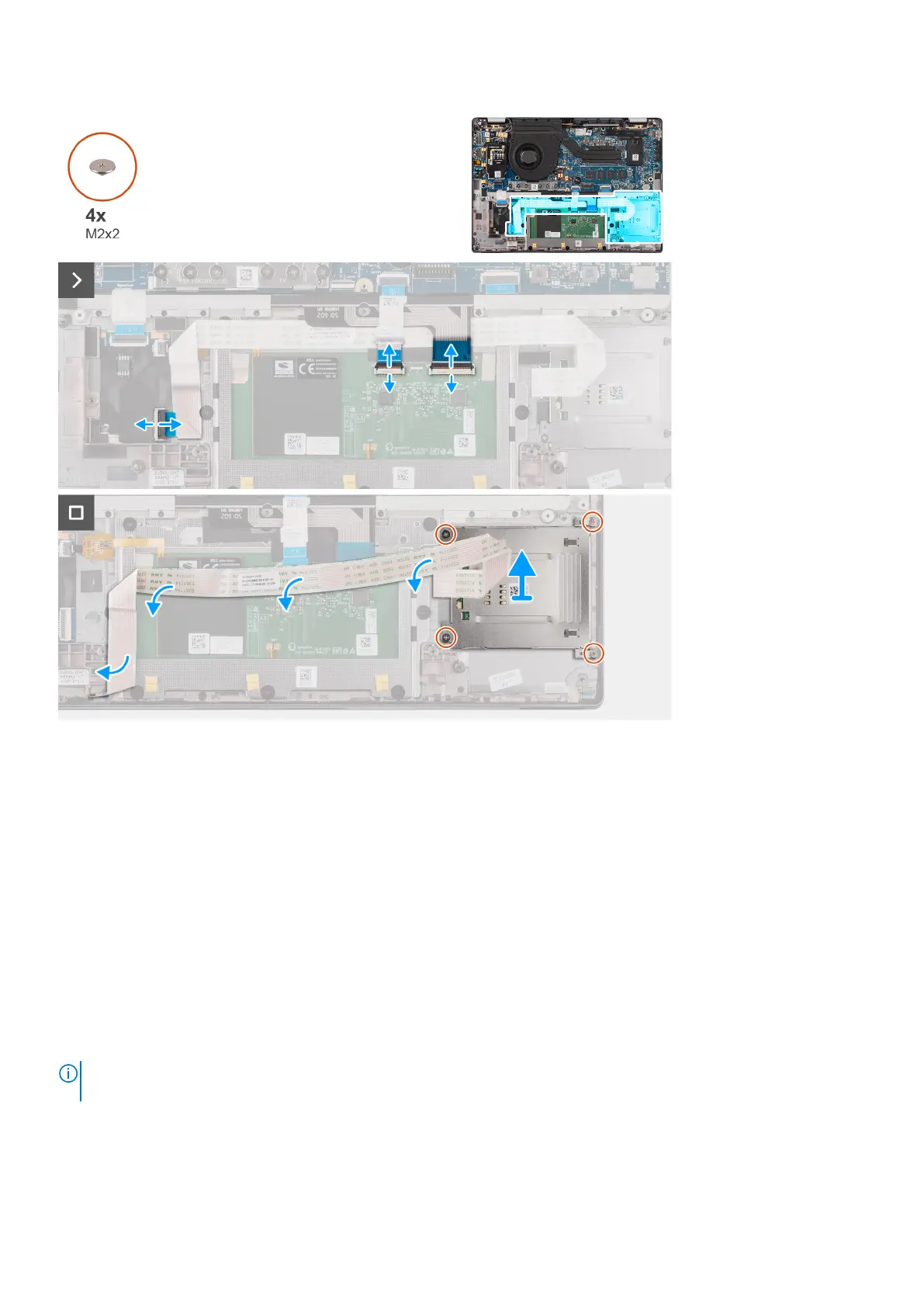 4. Remove the four screws (M2x2) that secure the smart card reader to the palm-rest and keyboard assembly.