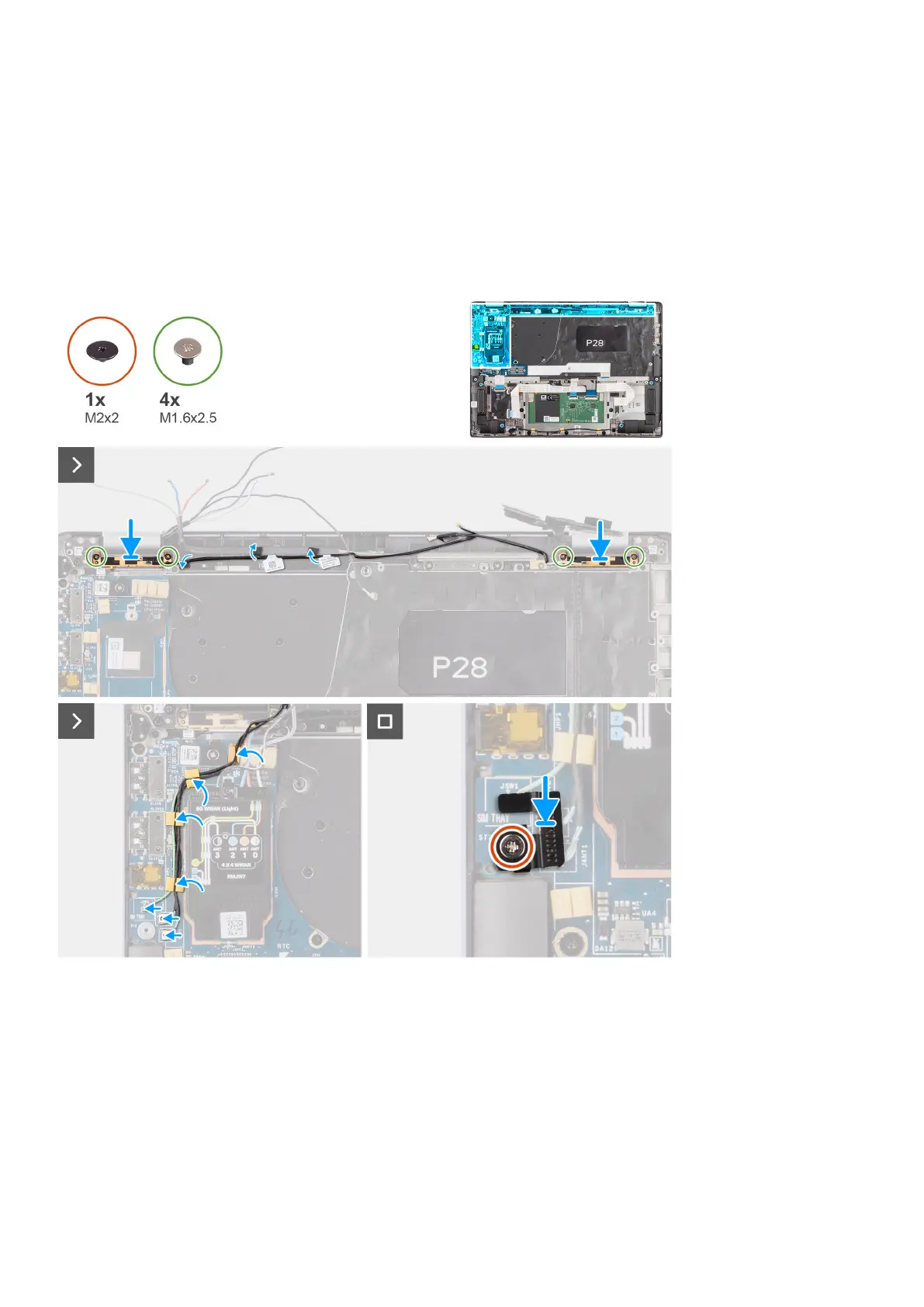 3. Replace the four screws (M1.6x2.5) that secure the WLAN-antenna module bracket on the system board.