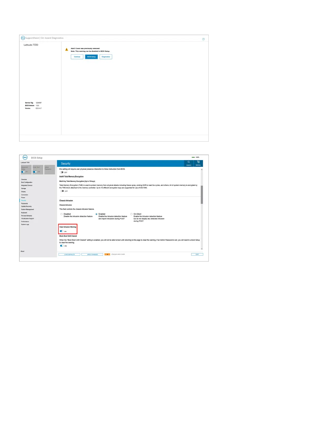 To clear the alert, set the Clear Intrusion Warning to ON in the Security menu of the BIOS setup.