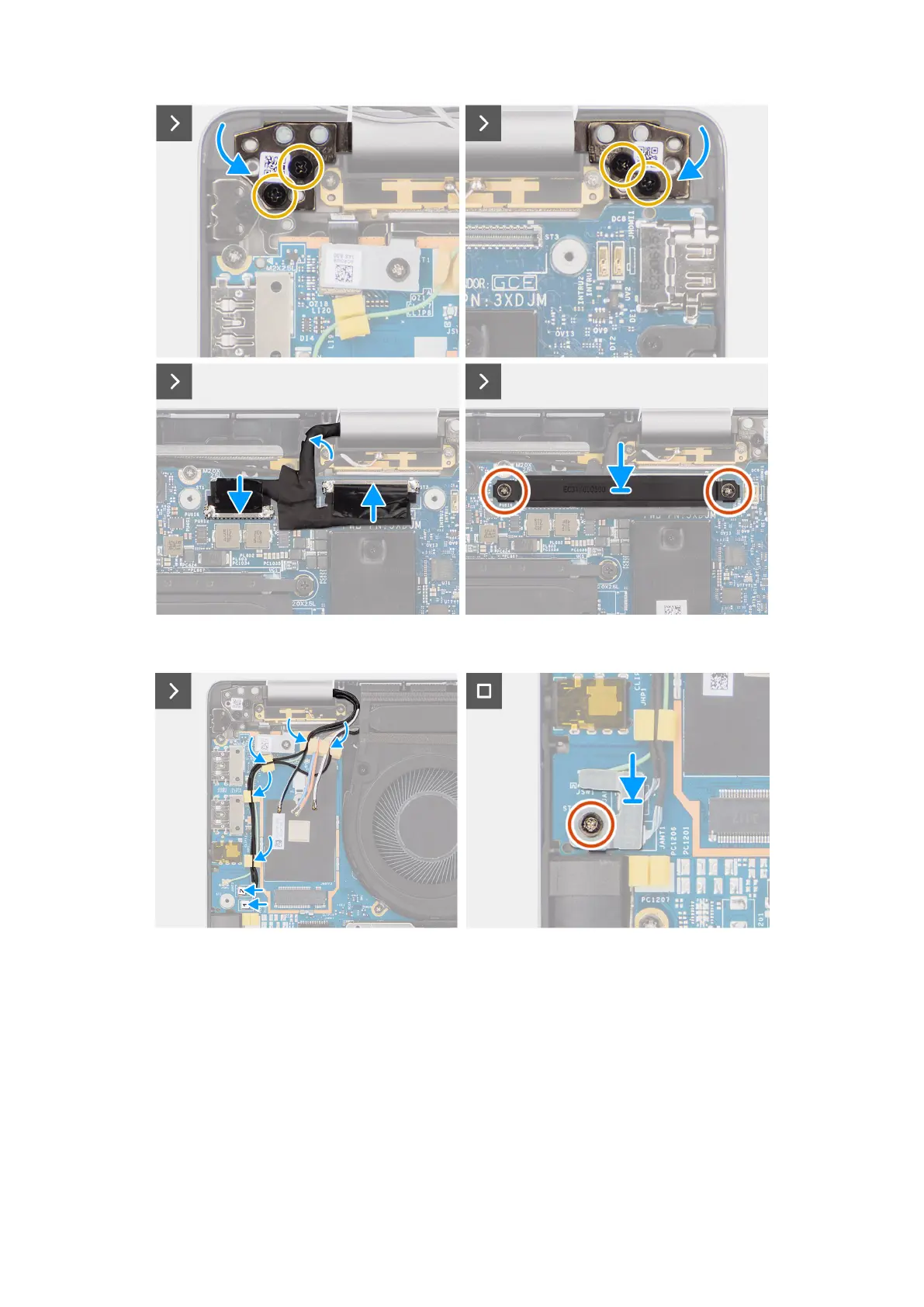 3. Replace the four screws (M2.5x5) that secure the display hinges to the system board.