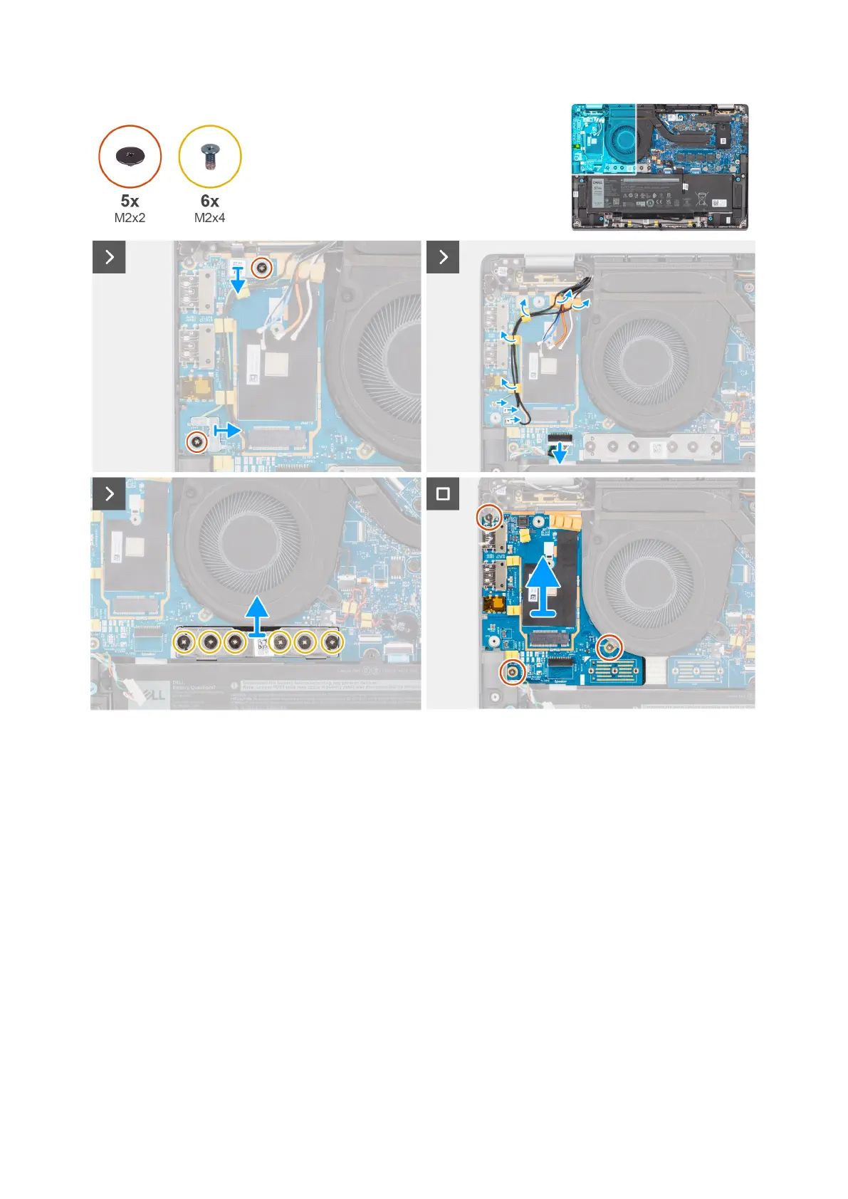 12. Remove the six screws (M2x4) that secures the I/O daughterboard bridge connector board to the palm-rest and keyboard
