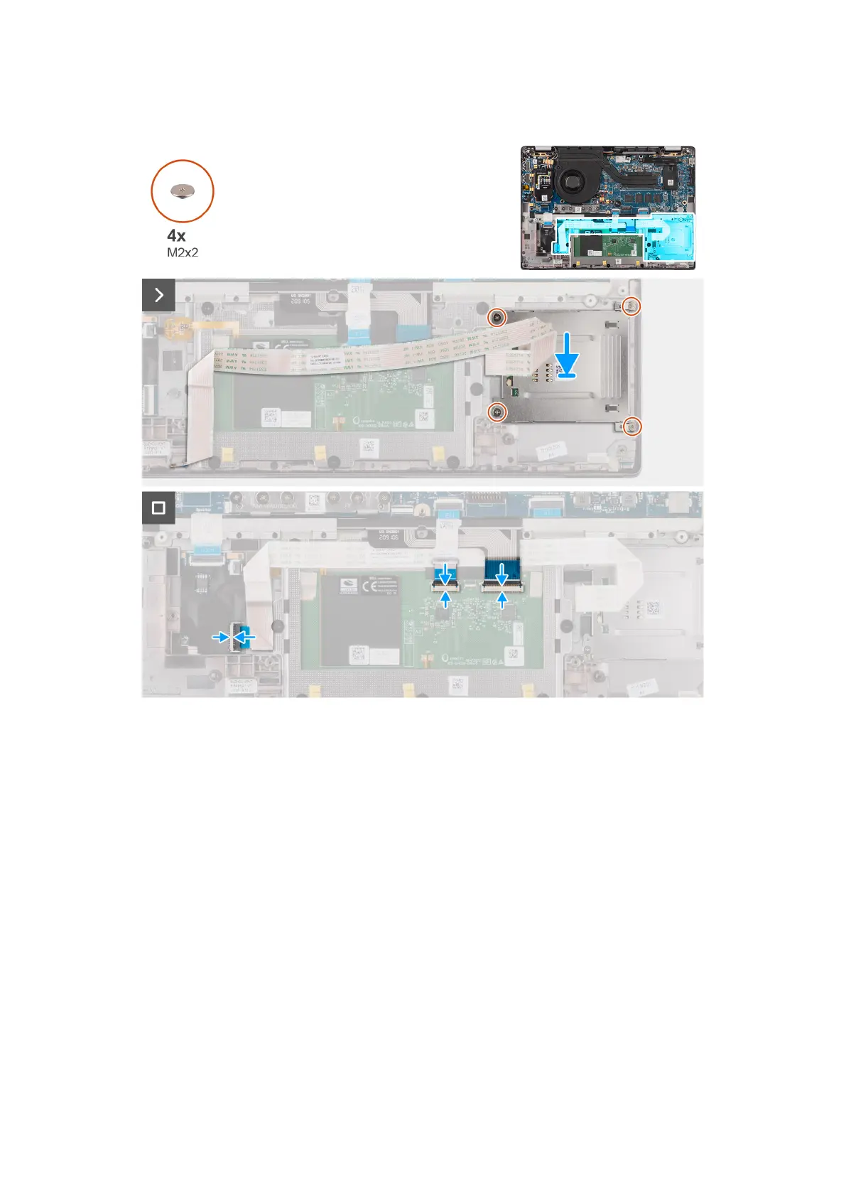2. Replace the four screws (M2x2) that secure the smart card reader to the palm-rest and keyboard assembly.