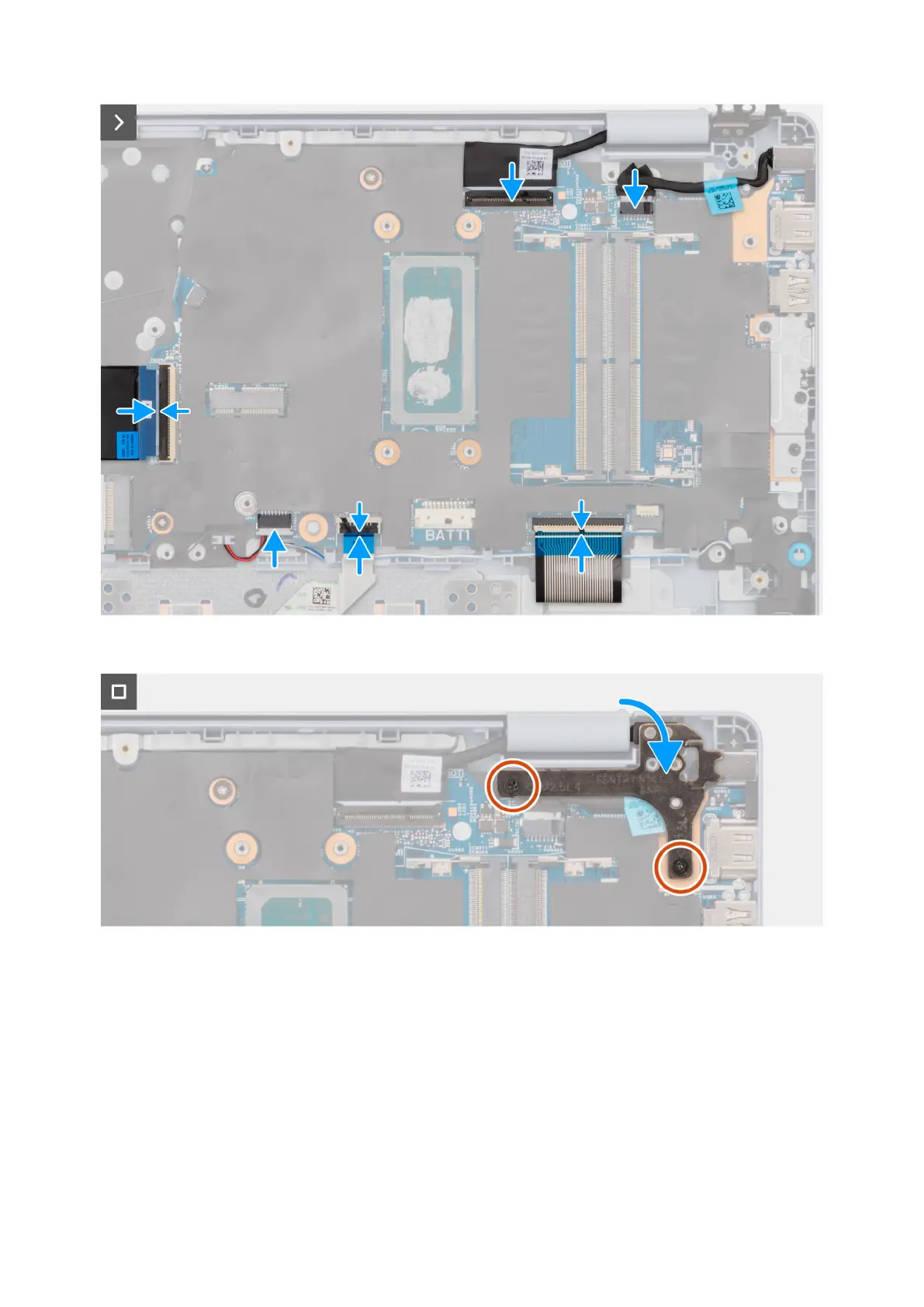 2. Replace the two screws (M2x2) that secure the system board to the palm-rest and keyboard assembly.