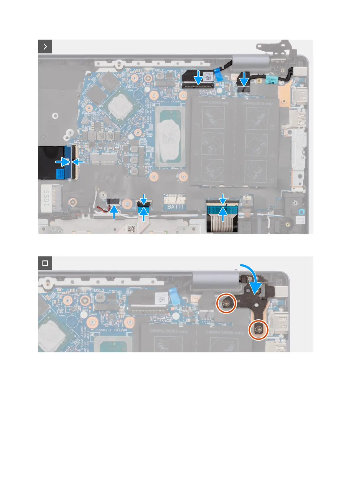 2. Replace the two screws (M2x2) that secure the system board to the palm-rest and keyboard assembly.