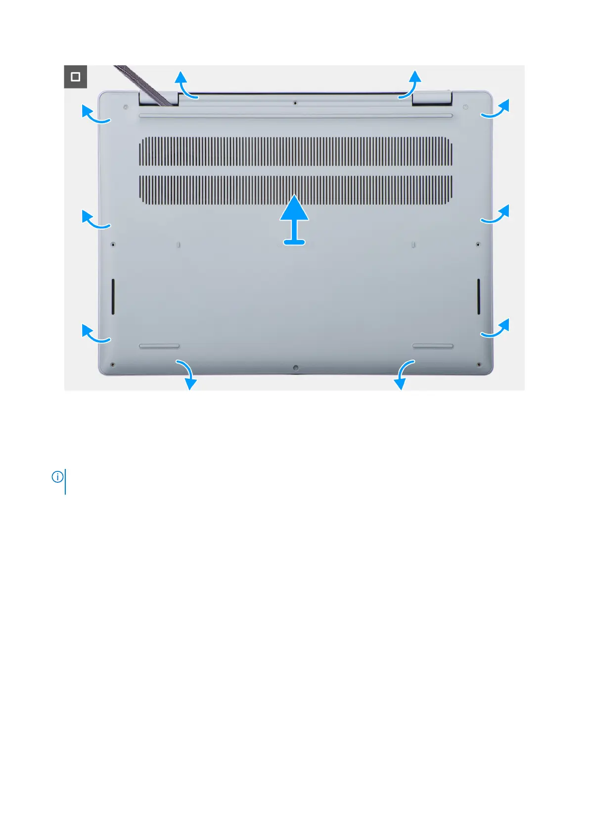 3. Starting from the top-left corner of the hinge, pry the base cover to release the base cover from the palm-rest and keyboard
