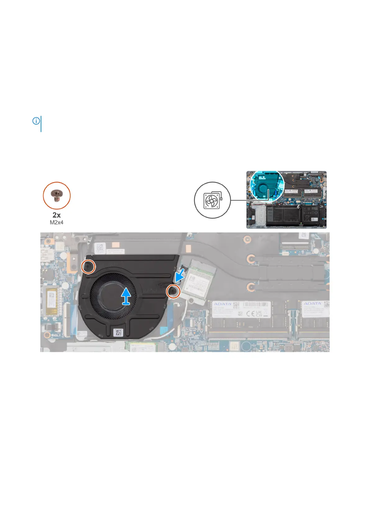 2. Remove the two screws (M2x4) that secure the fan to the palm-rest and keyboard assembly.