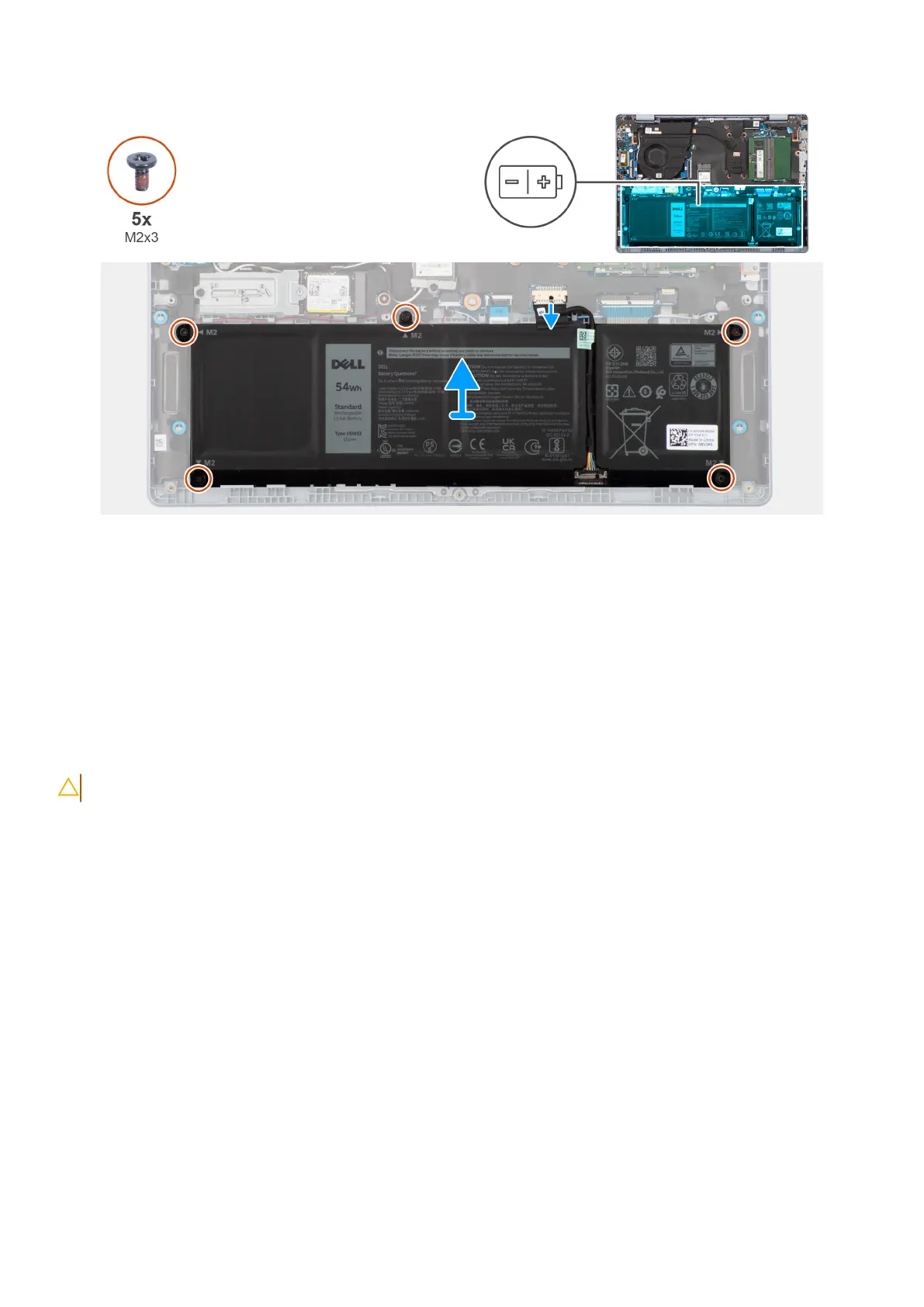 2. Remove the five screws (M2x3) that secure the battery to the palm-rest and keyboard assembly.