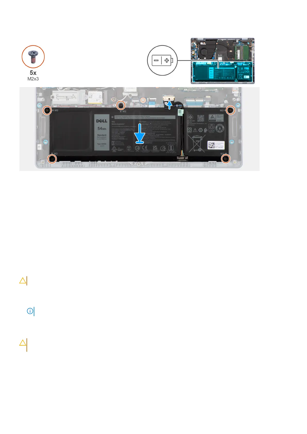 2. Replace the five screws (M2x3) that secure the battery to the palm-rest and keyboard assembly.