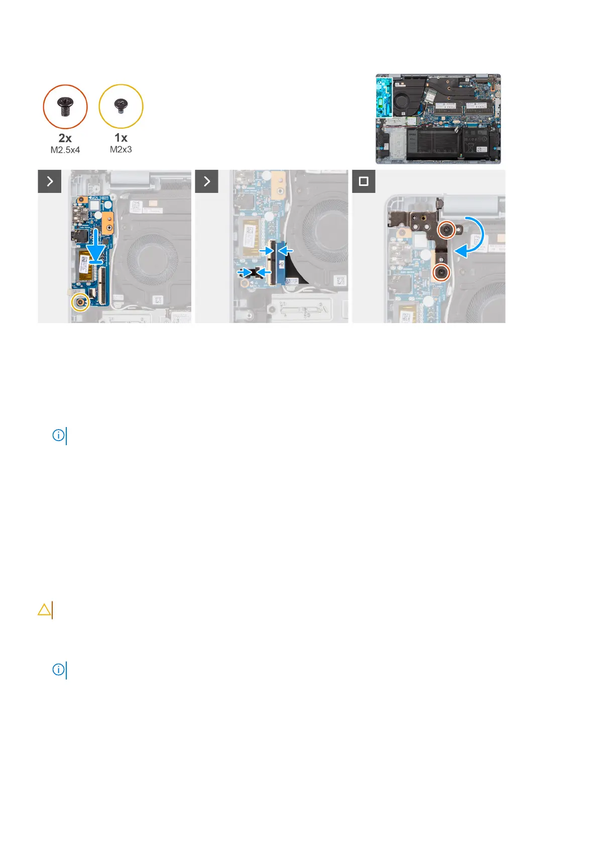 7. Replace the two screws (M2.5x4) that secure the left display hinge to the palm-rest and keyboard assembly.