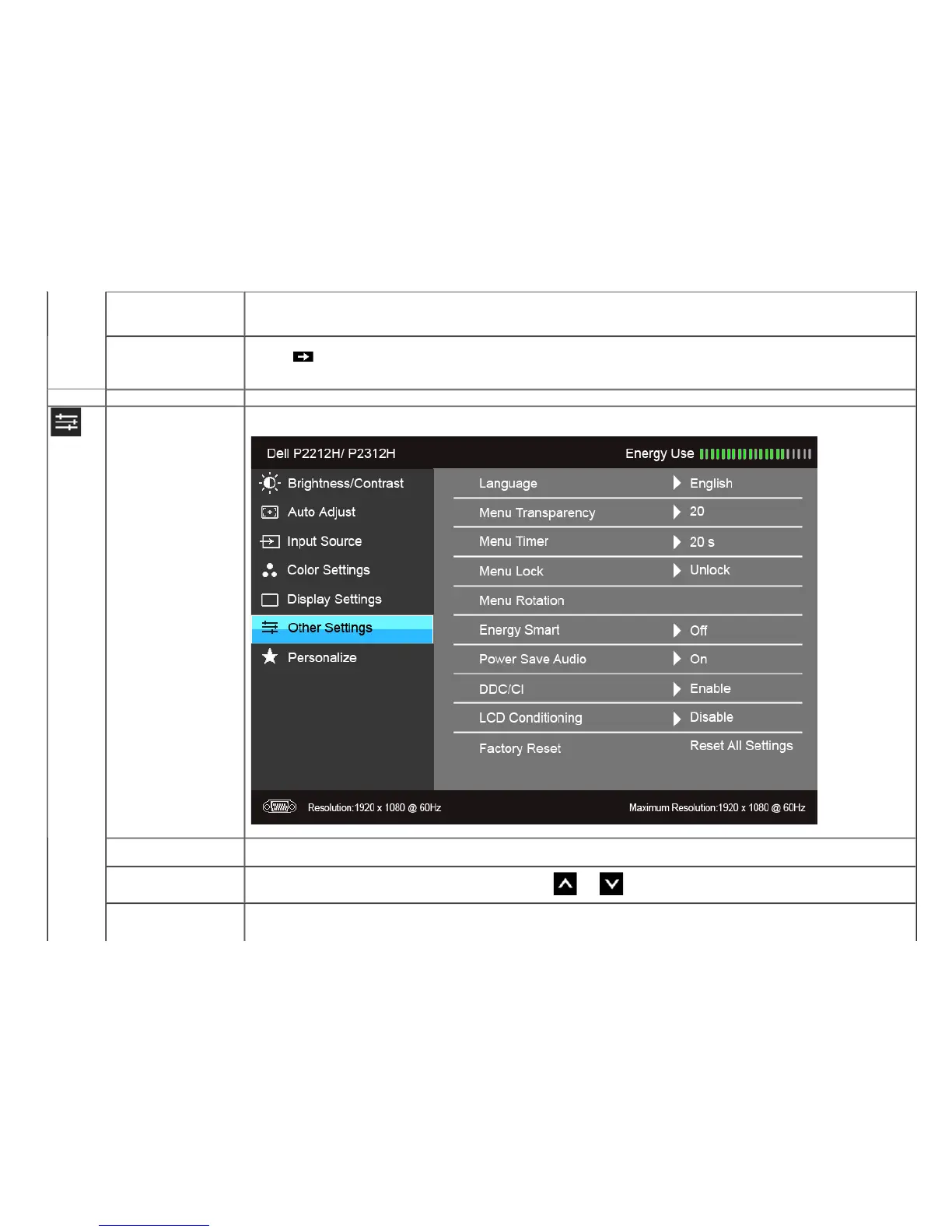 Other Settings Select this option to adjust the settings of the OSD, such as, the languages of the OSD, the amount of time the menu remains on screen, and so