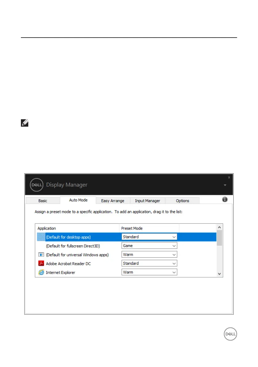 application, and apply it automatically. When Auto Mode is enabled, Dell Display