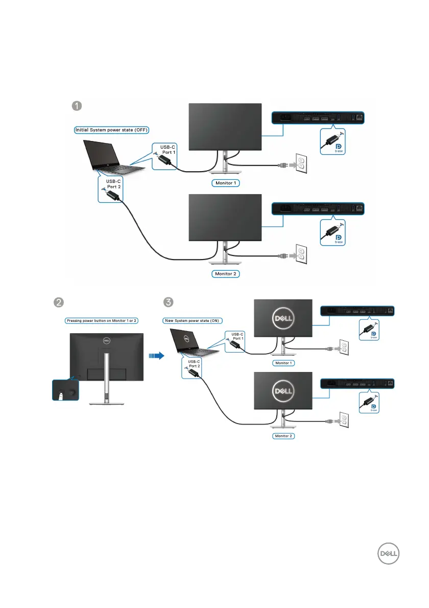 power button on Monitor 1 or Monitor 2 will turn ON the PC, Monitor 1, and