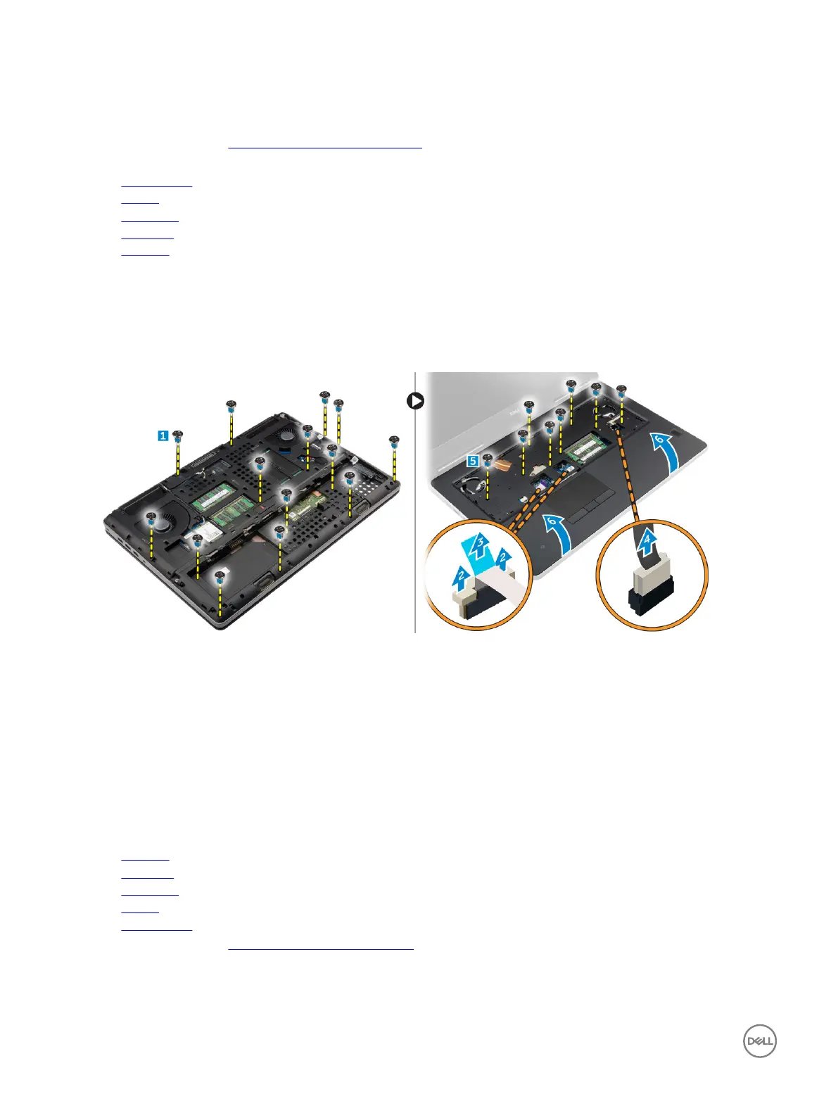 e. Release the tabs on the edges of the palmrest and remove the palmrest from the computer [6].