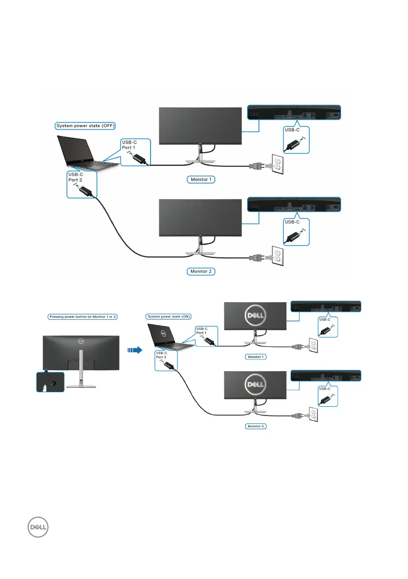 power button on Monitor 1 or Monitor 2 will turn ON the PC, Monitor 1, and Monitor