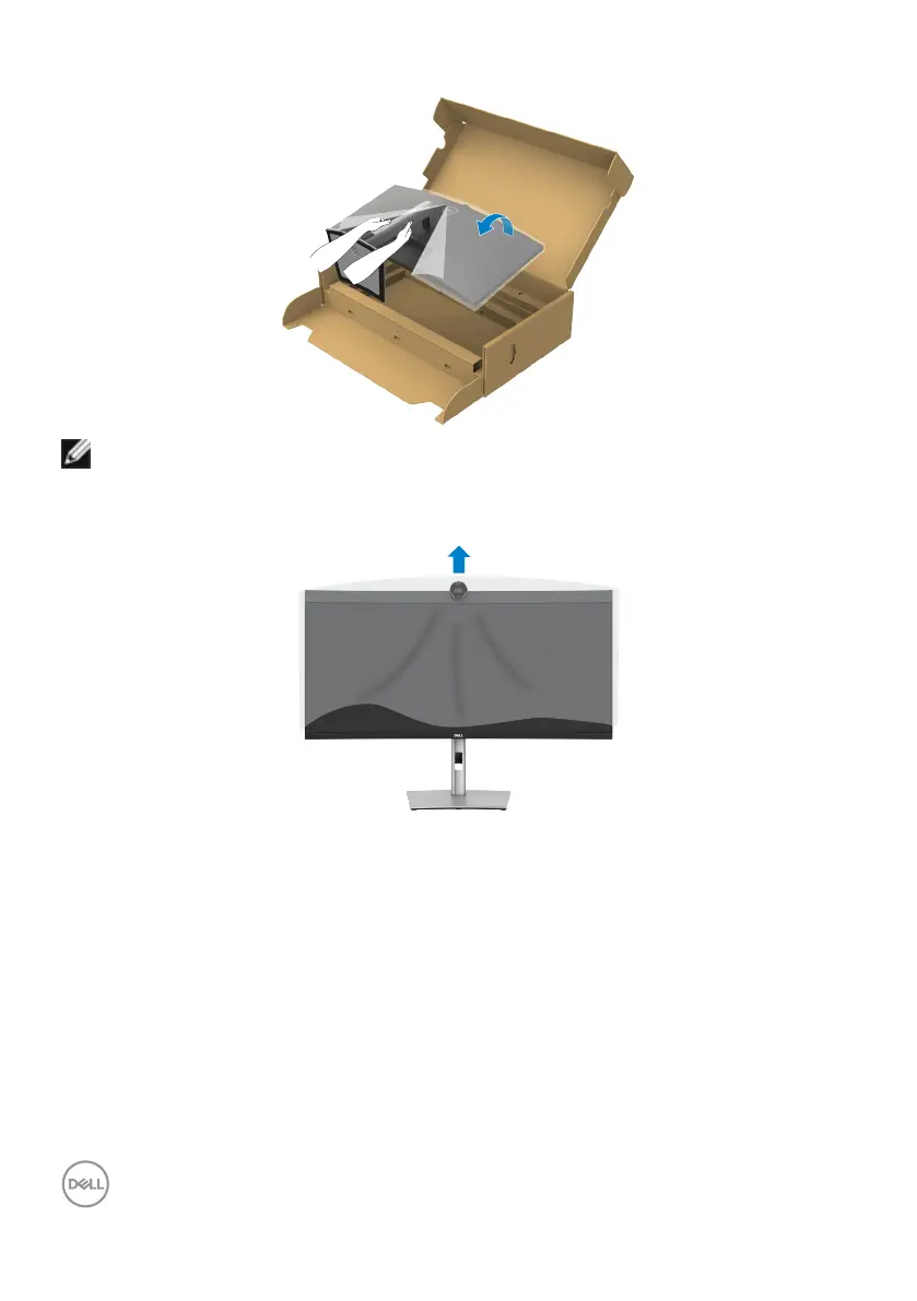 7. Hold the stand riser and lift the monitor carefully, then place it on a at surface.