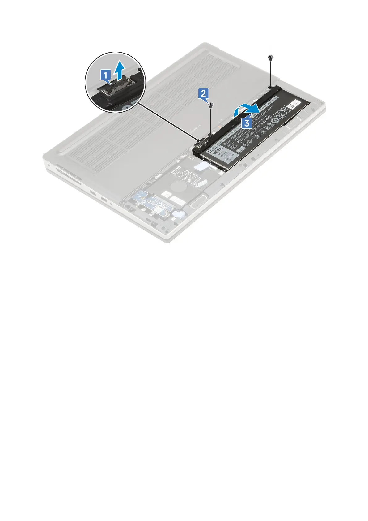 b. Replace the 3 (M2.5x3.0) screws to secure the battery to the system [2].