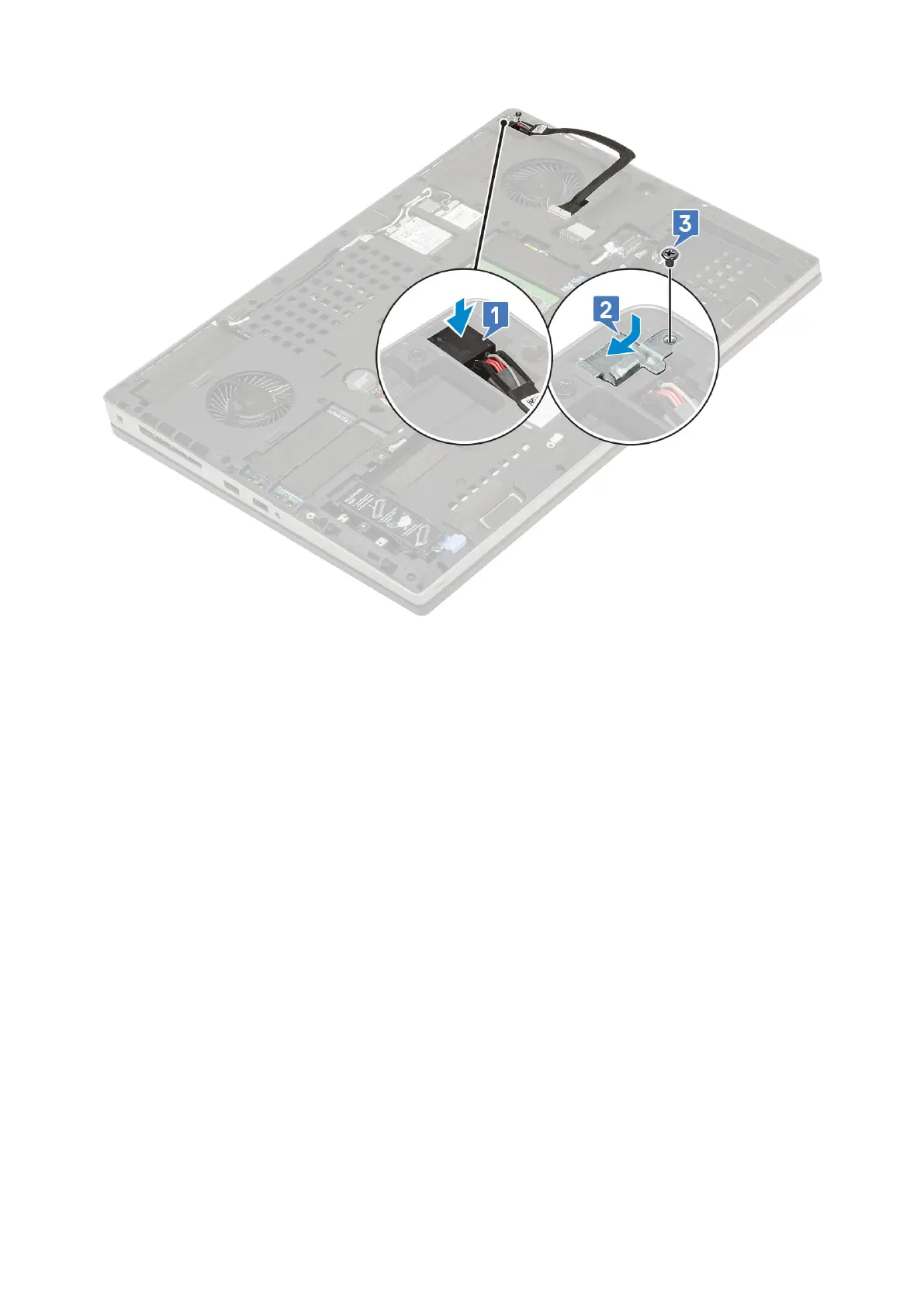 d. Affix the adhesive tape to secure the power connector cable in place [1].