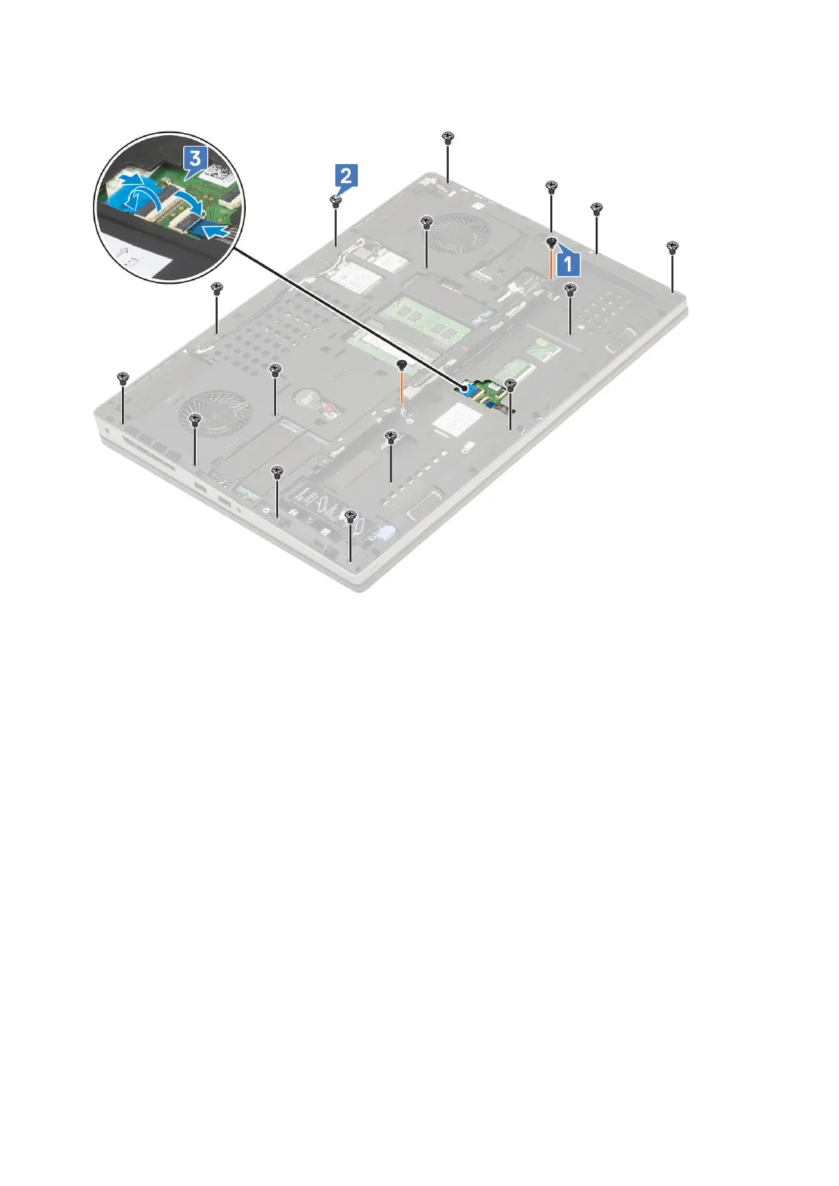 d. Turn the system and replace the 15 (M2.5x5.0) and the 2 (M2.0x3.0) screws to secure the palmrest to the system [1, 2].