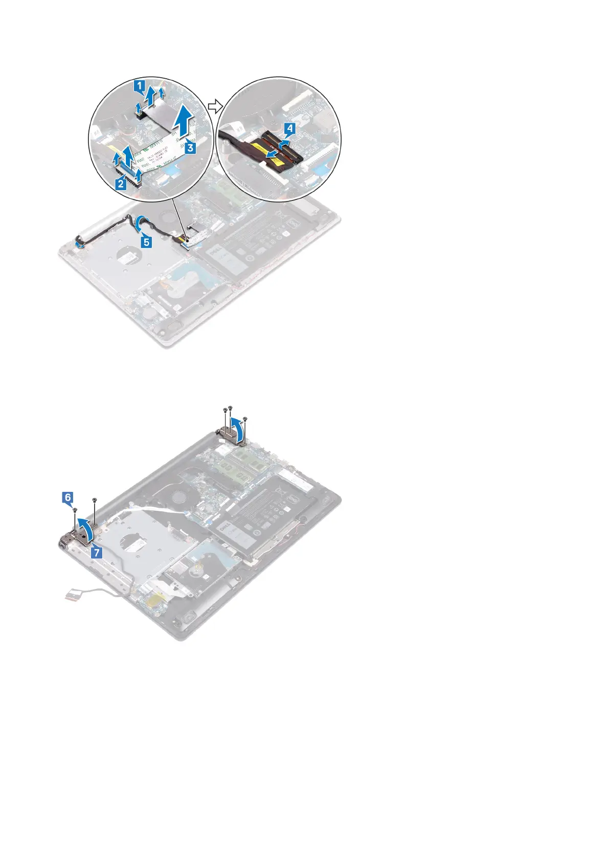 6. Remove the five screws (M2.5x5) that secure the left and right hinges to the system board and palm rest and keyboard