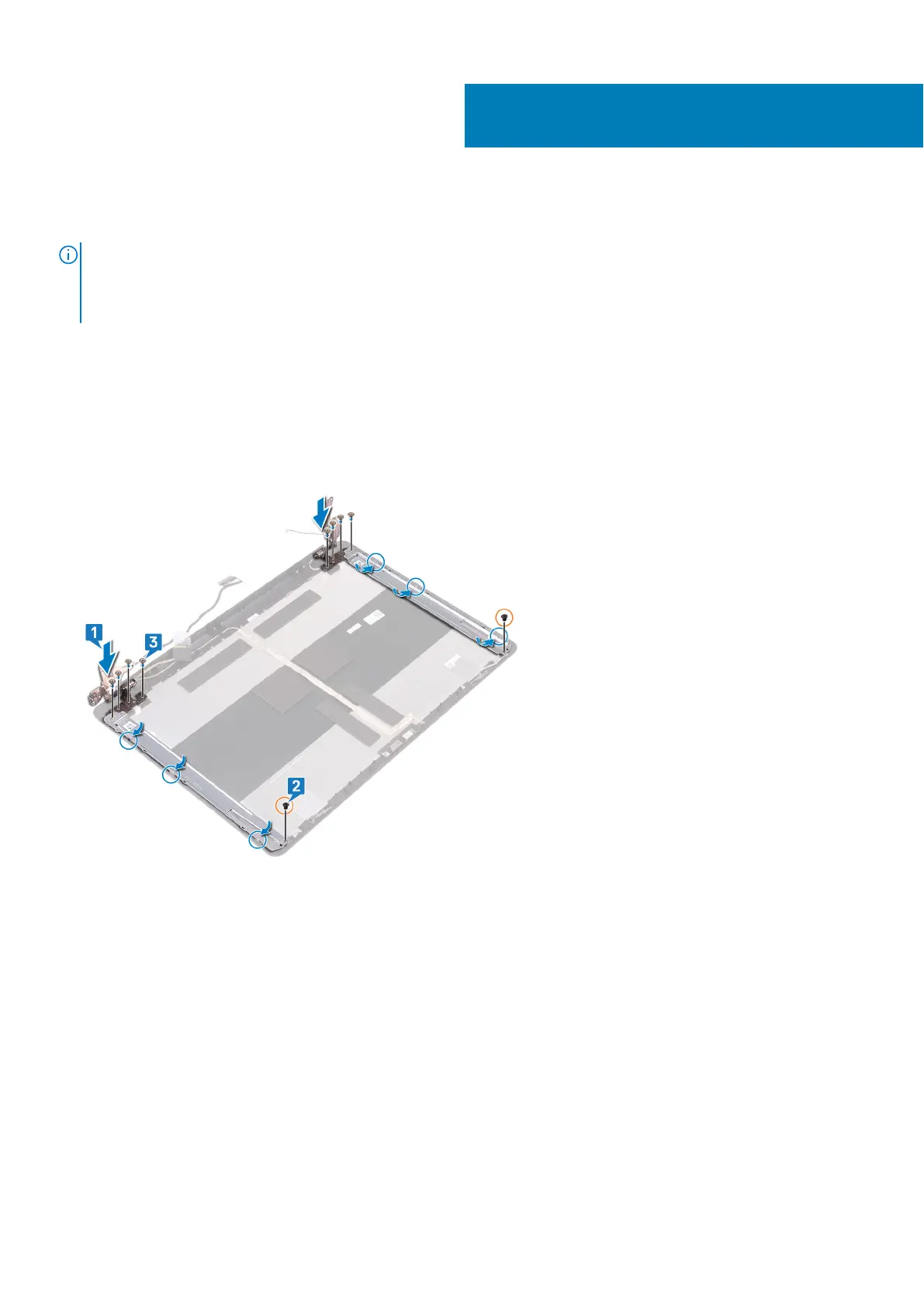 3. Replace the eight screws (M2.5x4) that secure the display hinges to the display back-cover and antenna assembly .