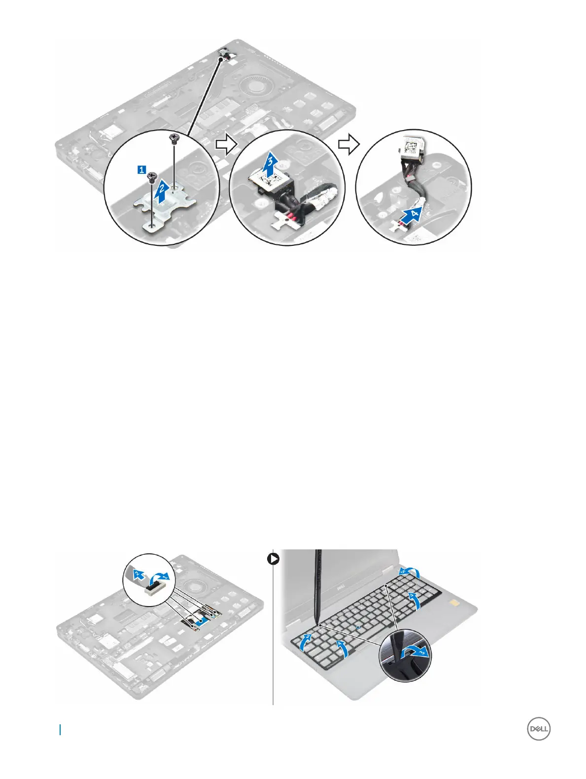 a Disconnect the keyboard cables from the connectors on the system board [1, 2].
