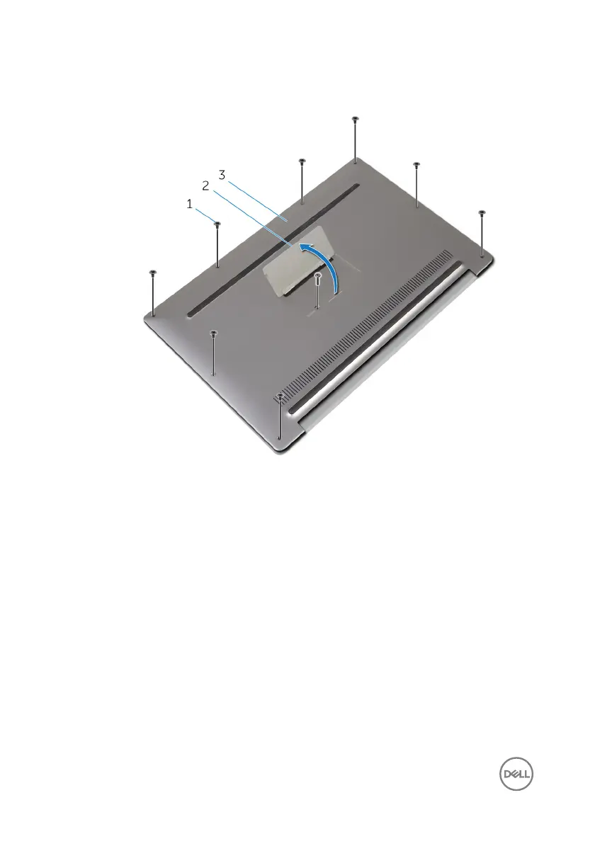 3 Remove the eight screws (M2x3, Torx) that secure the base cover to the palm-