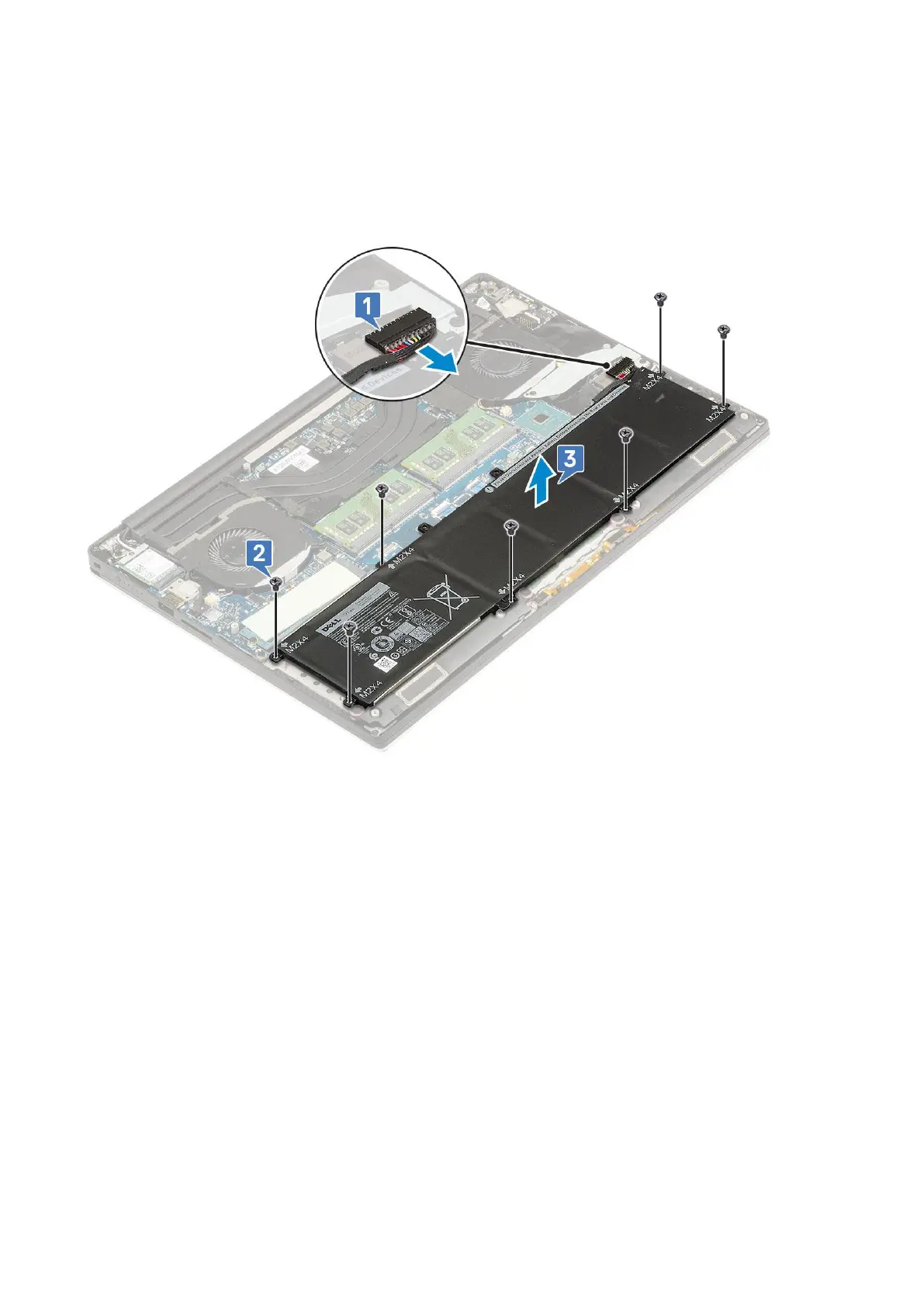 b. Remove the M2x4 (7) screws that secure the battery to the computer [2].