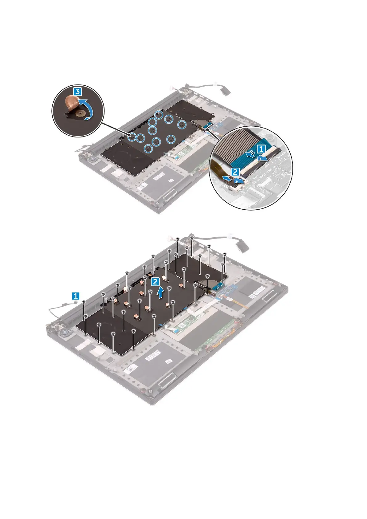 4. Un-route the Keyboard cable [1] and then remove the M1.6 x 1.5 (31) screws that secure the keyboard to the computer [2].