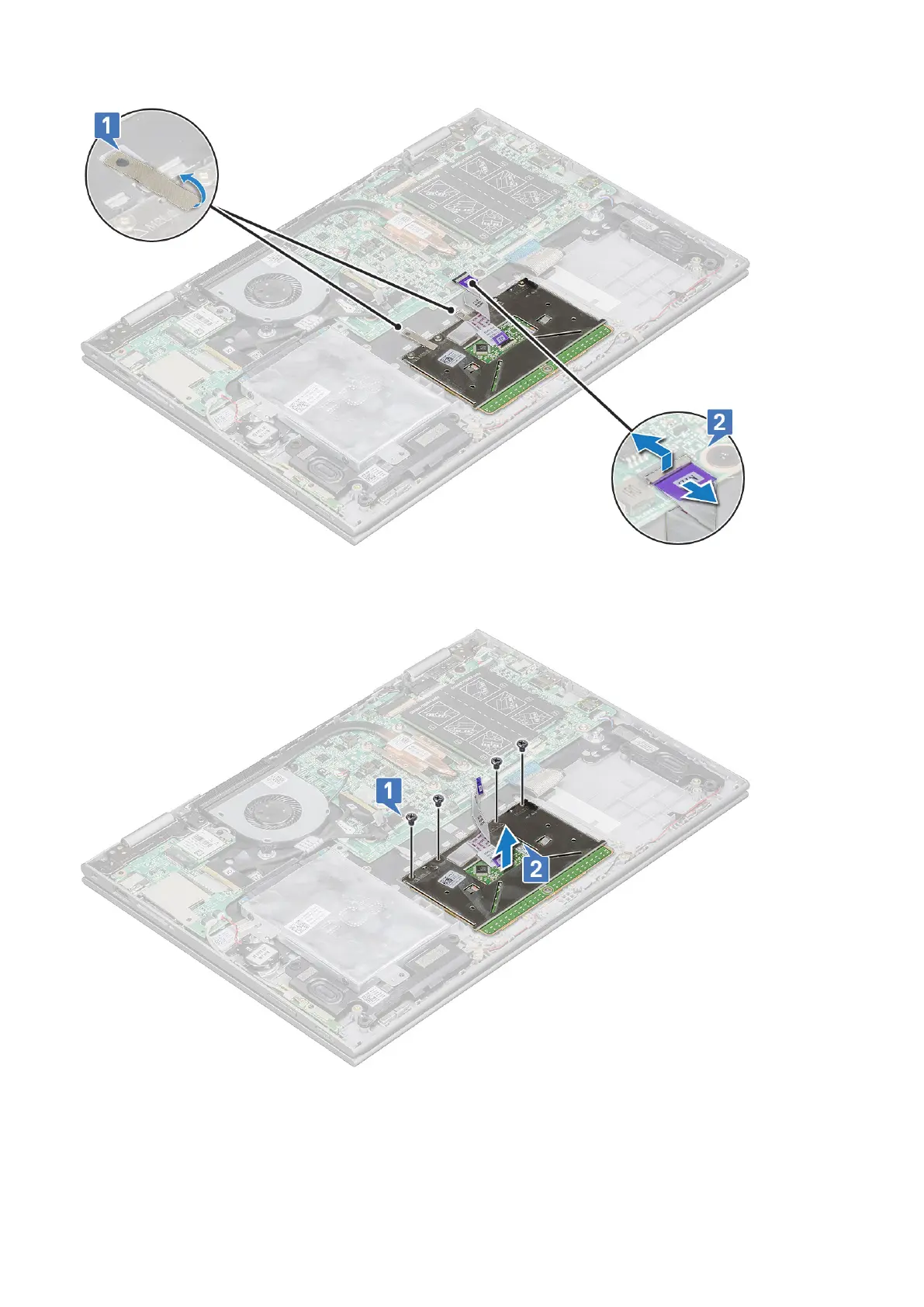b. Lift the touchpad away from the laptop chassis [2].