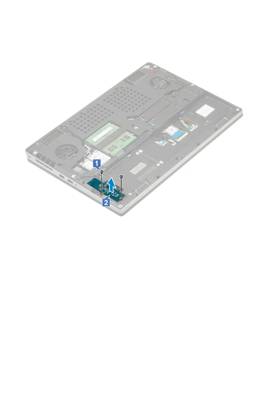 a. Remove the 2 (M2.0x3.0) screws that secure the hard drive interposer to the system board [1].