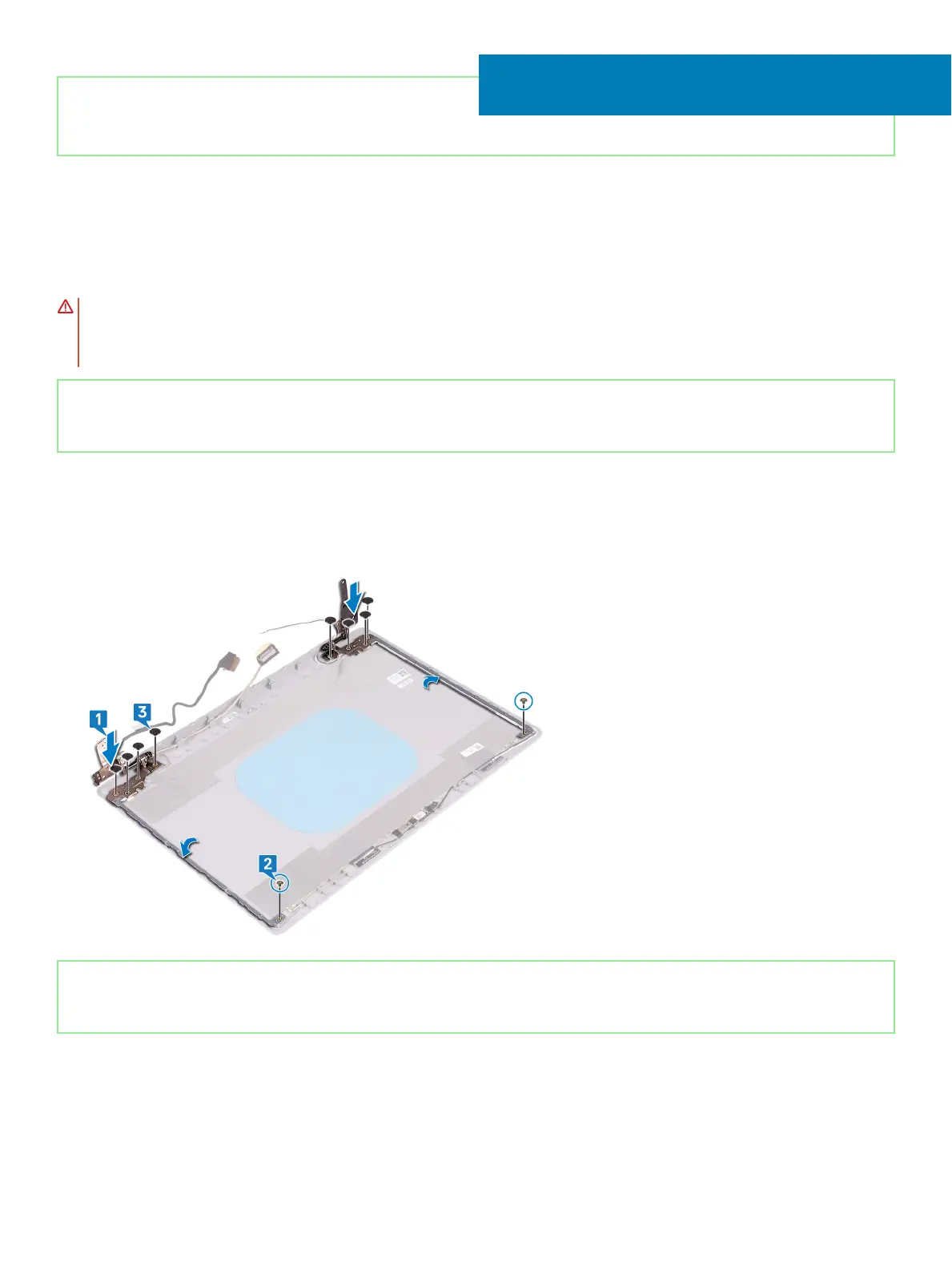 1 Align the screw holes on the hinges and brackets with the screw holes on the display back-cover and antenna assembly.